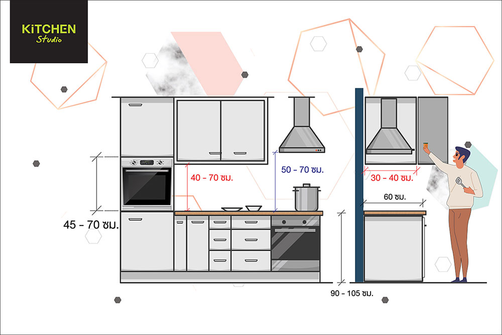 - ตู้เก็บของ: ตู้ลอยบิลต์อิน ชั้นวางของแขวนผนัง ควรสูงจากท็อปเคาน์เตอร์ครัวประมาณ 40 – 70 ซม. ลึกประมาณ 30 – 40 ซม.เพื่อหลักเลี่ยงศีรษะของผู้ใช้งานชนหรือกระแทก