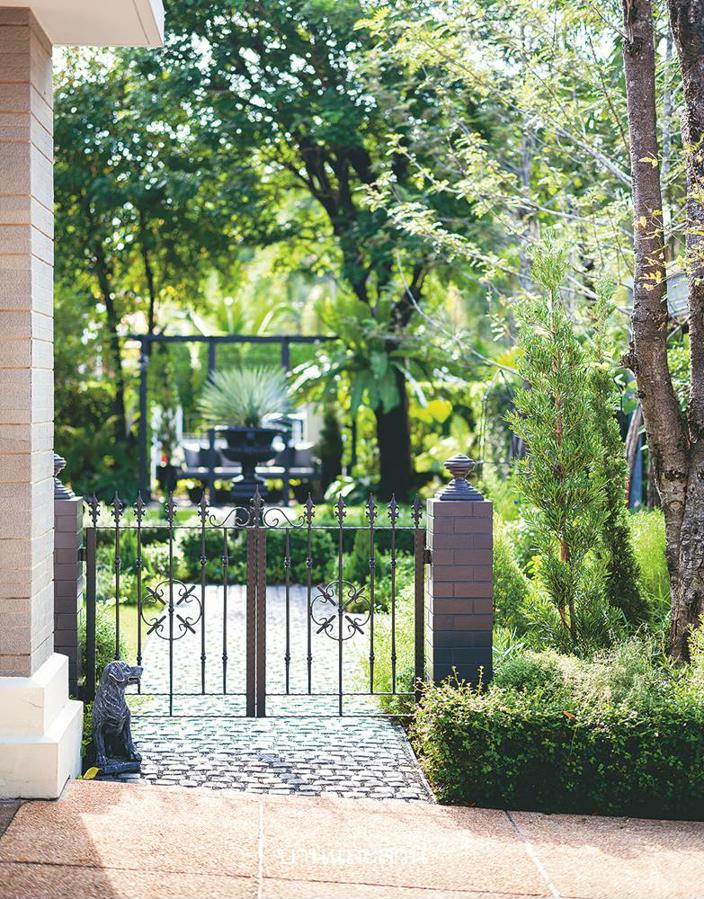 คุณนุ่นเล่าถึงการจัดสวนแห่งนี้บ้างว่า “ตอนที่เข้ามาคุยรายละเอียดกัน คุณเพาได้เตรียมแบบสวนที่ชอบให้ดู ซึ่งเป็นสวนอังกฤษในสไตล์ที่นุ่นถนัด การทำงานจึงไม่ยากเท่าไหร่ค่ะ คุณเพาชอบสีดำ ชอบสวนอังกฤษ สวนเดิมจะมีสนามหญ้าและต้นไม้ส่วนหนึ่ง คือดูแล้วผ่านการจัดมาประมาณหนึ่ง เป็นสวนแนวทรอปปิคัล แต่ฟังก์ชันการใช้งานในสวนไม่สะดวกนัก เช่น ทางเดินที่เป็นเนิน บางจุดมีปัญหาพื้นทรุด ทางเดินไม่เชื่อมโยงกัน ทำให้เดินลำบาก