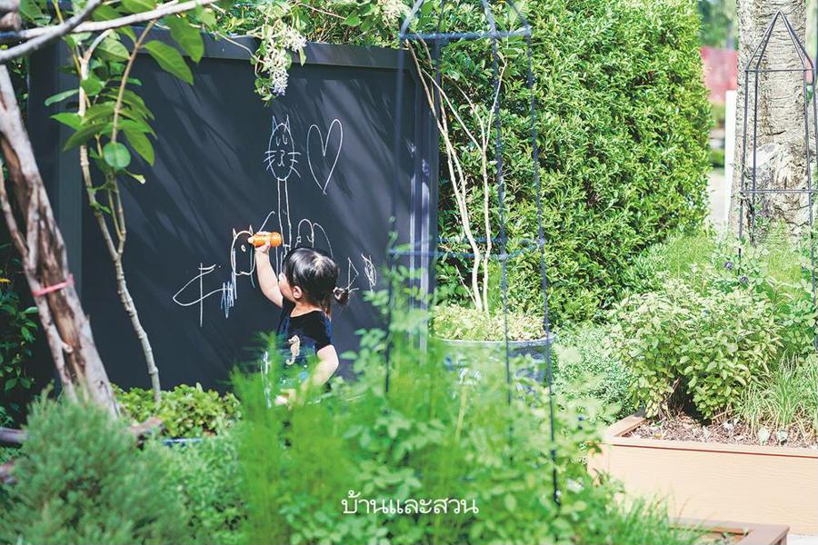 “ด้วยความที่ตัวเองทำ Playville เป็นสนามเด็กเล่นในร่มอยู่ที่สุขุมวิท 49 หลังเลิกเรียนจะพาลูกสาวไปเล่นที่นั่นเป็นประจำ เลยอยากทำสนามเด็กเล่นไว้ที่บ้านให้ลูกด้วยค่ะ ไหนๆ ก็คิดจะรีโนเวตสวนแล้ว อยากให้เป็นพื้นที่ที่ลูกใช้ทำกิจกรรมนอกบ้านได้ มีที่วิ่งเล่น มีแปลงปลูกผักสวนครัว เป็นสวนที่ดูแลง่ายๆ