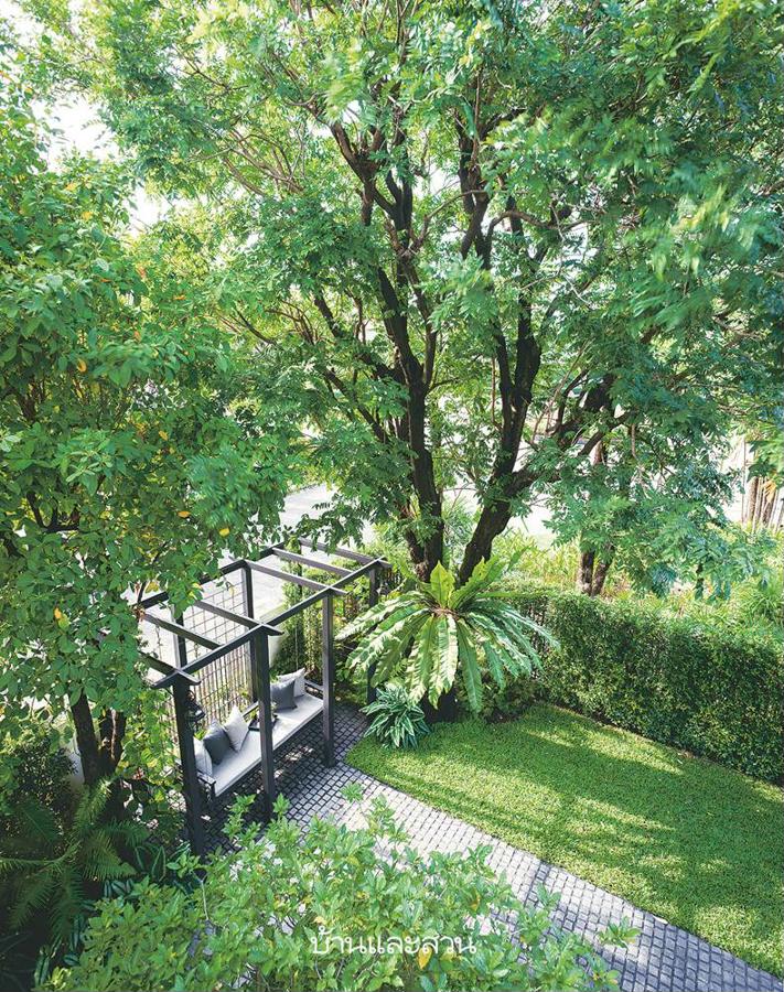 “ต้นไม้ใหญ่เป็นของเดิมบางส่วน ลงเพิ่มบางต้นเพื่อสร้างความร่มรื่น สไตล์ของนุ่นคือใช้ต้นไม้ที่หลากหลาย แต่ต้องดูแลง่าย ส่วนใหญ่เป็นพวกไม้ใบ แซมด้วยไม้ดอกในบางจุดเพื่อเพิ่มสีสันความน่าสนใจ คุมให้อยู่ในโทนสีขาว ชมพู ม่วง ในบริเวณที่ต้องการให้ดูเป็นระเบียบเรียบร้อย เช่น ริมทางเดิน ริมรั้ว หรือจุดที่ต้องการนำสายตา เช่น ทางเข้าบ้าน นุ่นจะเลือกใช้ต้นไม้ที่ตัดแต่งให้เป็นพุ่ม ดูฟอร์มัลหน่อย แต่ถ้าเป็นมุมสวนเล็กๆ ก็จะเลือกปลูกต้นไม้หลากหลายชนิดให้ดูฟุ้งๆ ให้อารมณ์แบบอิงลิชคอตเทจนิดๆ อาจแซมด้วยไม้ดอกล้มลุกบ้าง ถ้าต้นโทรมหรือตายก็แค่หาต้นใหม่มาเปลี่ยน มุมสวนเล็กๆ เหล่านี้ก็จะช่วยลดทอนความแข็งของแพตเทิร์นเส้นสายต่างๆ ที่เป็นกราฟิกในสวนที่มีค่อนข้างเยอะให้ดูซอฟต์ลงได้ค่ะ”