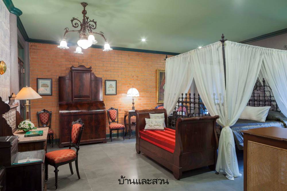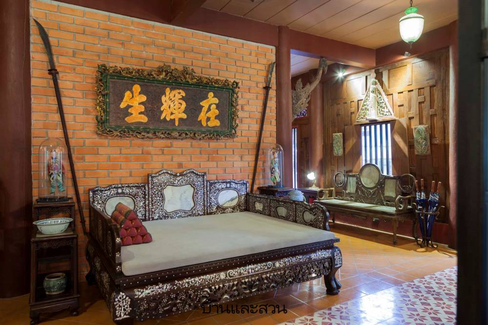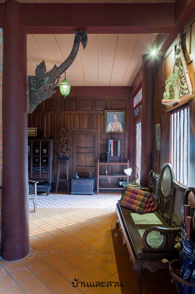 จากนั้นไปต่อที่ “เรือนสัตยาธิปไตย” เรือนไทยหมู่ภาคกลางสีแดงชาดซึ่งได้มาจากย่านฝั่งธนบุรีที่สืบสายศิลปะมาจากกรุงศรีอยุธยา “โดยส่วนตัวผมชอบเรือนไทยทางฝั่งธนบุรีมาก ส่วนใหญ่เป็นเรือนขุนนางและคหบดี” คุณโอ๊คกล่าวขณะพาชมบรรยากาศภายในเรือน ซึ่งตกแต่งด้วยเครื่องเรือนจากหลากหลายเชื้อชาติ ทั้งไทย จีน ฝรั่ง และอินเดียผสมผสานกัน ทั้งหมดอยู่ในสมัยวิกตอเรียแทบทั้งสิ้น การจัดวางเครื่องเรือนของเรือนหลังนี้ ยังทำให้เห็นว่าวัฒนธรรมตะวันตกได้เข้ามามีบทบาทในแผ่นดินสยามในช่วงนั้น