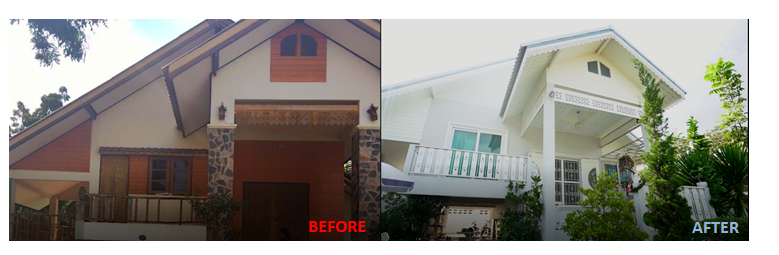 โครงหลักของบ้านยังคงเก็บไว้ แต่เปลี่ยนโฉมใหม่ให้ดูร่วมสมัยขึ้น ทั้งประตู-หน้าต่าง ราวระเบียง เสาหน้าบ้าน ส่วนตกแต่งอื่น ๆ รวมทั้งหลังคา และทาสีขาวทำให้บ้านดูสวยงามและน่าอยู่