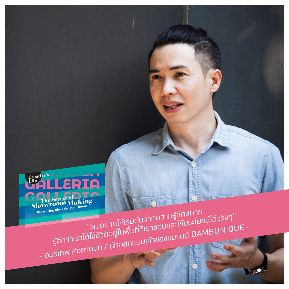 เมื่อ คุณอมรเทพ คัชชานนท์ นักออกแบบเฟอร์นิเจอร์เจ้าของแบรนด์ Bambunique ผู้เห็นความงามของไม้ไผ่และนำเสนอผ่านวิธีการ บีบ ดัด รัด จนได้ผลงานออกแบบที่แตกต่างจากงานพื้นบ้านทั่วไป จะรับหน้าที่เป็นผู้ออกแบบพื้นที่การทำงานในคอนเซ็ปต์ Creative’s Life Galleria ให้กับ มล.ภาวินี สันติศิริ นักออกแบบรุ่นพี่ผู้บุกเบิกงานออกแบบเฟอร์นิเจอร์ในยุคแรก ๆ ของไทย ให้เป็นที่รู้จักทั้งในไทยและต่างชาติ ผ่านแบรนด์ Ayodhaya (อโยธยา) ที่นำวัสดุพื้นบ้านมาใช้สร้างสรรค์งานเช่นเดียวกัน