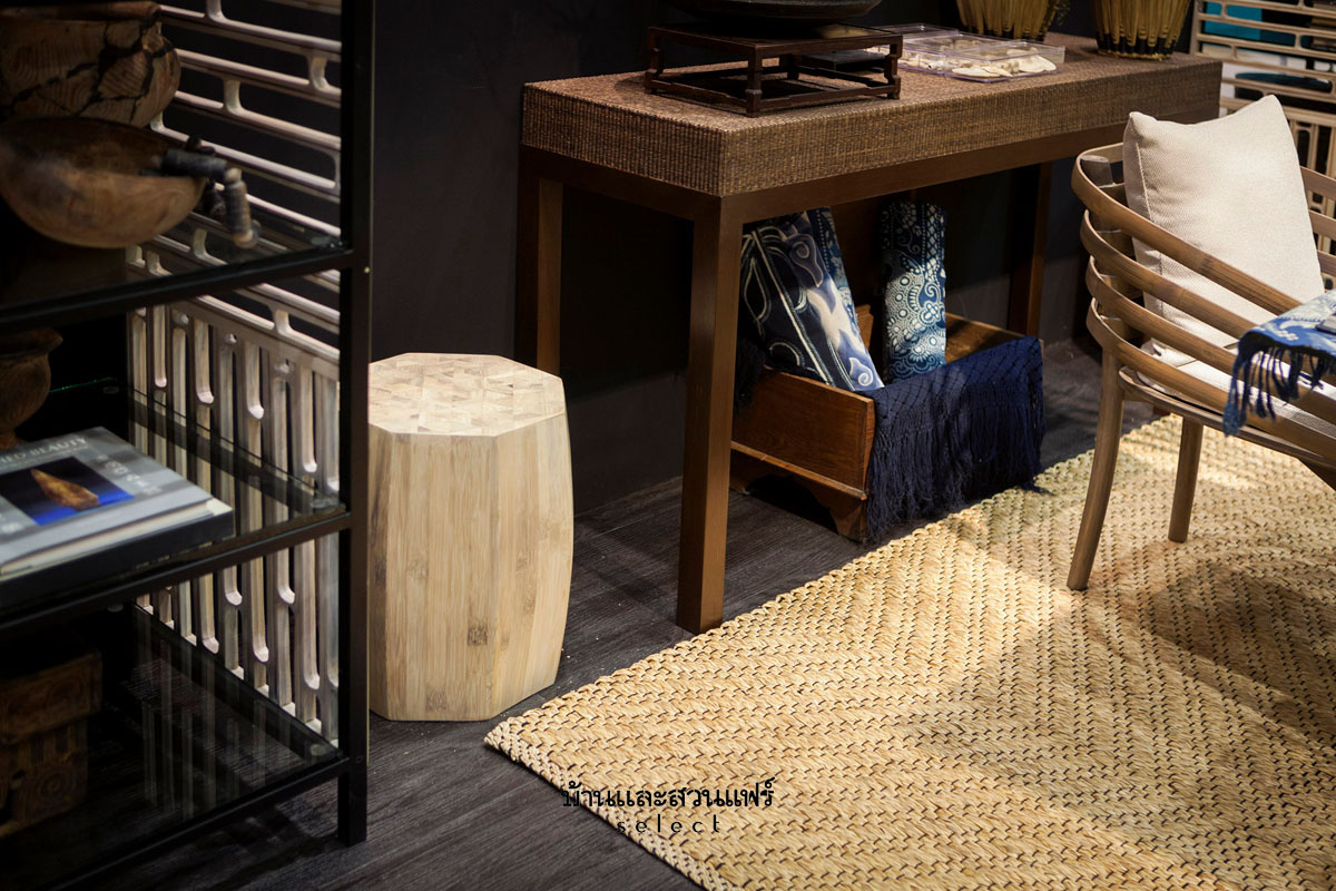 คุณอมรเทพ ดึงคาแร็กเตอร์ของความเป็นงานฝีมือที่ใช้วัสดุพื้นบ้าน เช่น งานไม้ไผ่ หวาย และผักตบชวา มาทำงานร่วมสมัยที่มีดีไซน์และสร้างมูลค่าได้ “เฟอร์นิเจอร์ที่นำมาใช้แต่ละชิ้นจึงมีจุดเด่นในเรื่องการให้องค์ความรู้ในงานออกแบบที่ไม่ใช่ใครก็ทำได้ แต่ต้องใช้ความรู้เฉพาะทางของช่างฝีมือ เทคนิกการทำแต่ละชิ้นจึงมีความพิเศษที่คนอาจจะมองผิวเผินแล้วไม่มีอะไร แต่เมื่อได้สัมผัสพื้นผิวสัมผัสหรือดูรายละเอียดให้ดีแล้วจะเกิดคำถามว่าทำได้ยังไง” คุณอมรเทพพูดถึงเฟอร์นิเจอร์ของสมาชิกในกลุ่ม D&O ที่เลือกนำมาใช้ในการแสดงงาน ไม่ว่าจะเป็นแบรนด์ Bambunique ของเขาเอง, Corner 43, Korakot รวมถึง Ayodhaya ของเจ้าของพื้นที่เองด้วย
