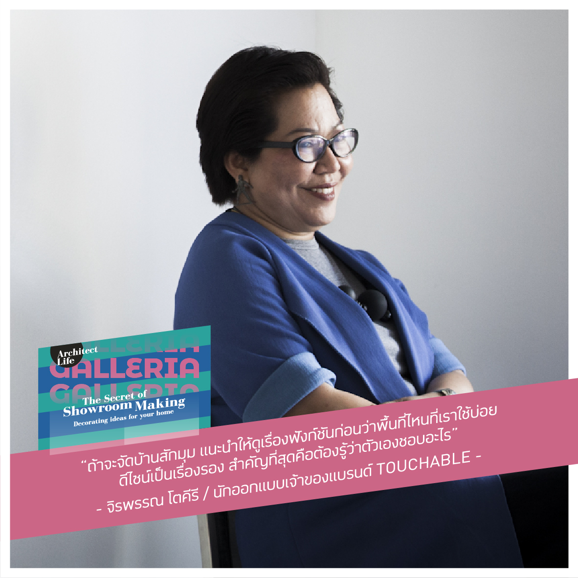 คุณจิรพรรณ โตคีรี นักออกแบบเจ้าของ ทัชเอเบิล (TOUCHABLE) แบรนด์เฟอร์นิเจอร์และโคมไฟที่โดดเด่นเรื่องการใช้งาน 1 ใน 5 นักออกแบบจากสมาคมผู้ผลิตผลิตภัณฑ์แนวดีไซน์ (Design and Objects Association) ที่มาร่วมกับนิตยสาร room สร้างสรรค์พื้นที่สะท้อนตัวตนให้กับแขกรับเชิญพิเศษจากต่างสาขาอาชีพ ในนิทรรศการ “The Secret of Showroom Making” ที่จัดขึ้นภายใต้คอนเซ็ปต์ ‘Real Life Galleria’