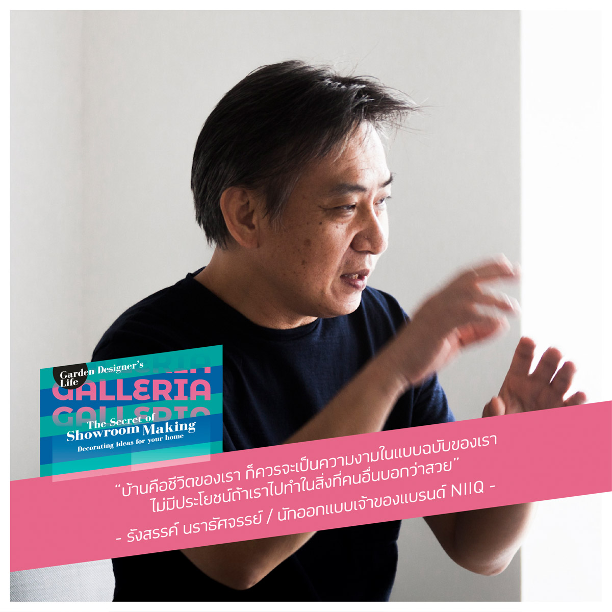 Garden Designer’s Life Galleria คือคอนเซ็ปต์ที่ คุณหนุ่ม-รังสรรค์ นราธัศจรรย์ หนึ่งในสมาชิกคนสำคัญแห่งสมาคมผู้ผลิตผลิตภัณฑ์แนวดีไซน์ นักออกแบบและผู้ก่อตั้ง niiq แบรนด์ฟอร์นิเจอร์ไม้ที่ยึดความเรียบง่าย ความเป็นธรรมชาติ และความเฉพาะตัว หยิบยกมาออกแบบพื้นที่ห้องทำงานให้กับ คุณโซ่-คามินท์ เลิศขจรสุข ซึ่งเป็น 1 ใน 5 ผลงานห้องตัวอย่างจาก 5 แขกรับเชิญพิเศษที่เป็นตัวแทนของคนที่มีตัวตนและไลฟ์สไตล์ที่ชัดเจน