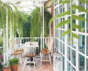 บ้านไทยนิยมทำชานหรือระเบียงสำหรับออกมานั่งเล่นรับลม โดยทำราวระเบียงจากไม้ท่อน ไม้ฉลุลายหรือไม้กลึง แต่สำหรับบ้านนี้ประยุกต์ใช้แผงหัวเตียงไม้เก่าที่ตกแต่งด้วยไม้กลึงซึ่งมีความโปร่งนำมากั้นโดยรอบ แล้วเสริมด้านข้างให้พอดีระยะช่วงเสา ก็ได้ราวระเบียงกลิ่นอายไทยที่เก๋สุดๆ