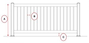 ราวระเบียง ต้องมีความสูงไม่น้อยกว่า 42 นิ้ว หรือ 1,066 มม. (ระยะ A) - ช่องว่างระหว่างซี่ลูกกรง (Picket) มีความกว้างไม่เกิน 4 นิ้ว หรือ 100 มม. (ระยะ B)