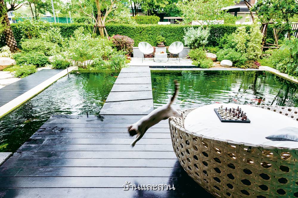 “เราไม่ได้ปรับพื้นที่มากนัก ส่วนใหญ่เป็นพวกงานโครงสร้างอย่างทางเดินในสวน ลานอเนกประสงค์ ส่วนบ่อน้ำกับสะพานเป็นของเดิม เราแค่ทำความสะอาดและทาสีใหม่ให้เข้ากับธีมสวนที่ออกแบบ ผมกำหนดให้ลานอเนกประสงค์อยู่กึ่งกลางพื้นที่สวน เดิมไม้ใหญ่มีแค่อินทผลัมต้นเดียว เราก็ลงไม้ใหญ่เพิ่มเพื่อให้มีความร่มรื่นมากขึ้น เลือกใช้ต้นไม้ใหญ่มาลงเลย เพื่อให้ได้ร่มเงาและทรงต้นที่สวยทันใจ โดยผมจะดูมุมมองจากในบ้านเป็นหลัก คือจากห้องนั่งเล่นมองออกมาเห็นสวนที่เป็นมุมมองต่อเนื่องกันจากภายในบ้านได้ เราเล่นเรื่องจังหวะการจัดวางให้มีระดับสูงต่ำ ระยะตื้นลึก ดูมีรายละเอียด และมีการเล่นระดับพื้นให้แตกต่างกันในแต่ละโซน ไม่ว่าจะเป็นสวนญี่ปุ่นหน้าบ้าน ลานอเนกประสงค์ที่กลางสวน หรือบ่อปลาด้านหน้าห้องนั่งเล่นที่เชื่อมต่อกันด้วยทางเดินในสวนที่ทำจากทรายล้างสีดำ ซึ่งทำขึ้นมาใหม่ เพื่อให้ได้สีและขนาดที่ต้องการ แทรกด้วยกลุ่มไม้พุ่มที่เล่นระดับและสีสัน ทำให้สวนดูมีมิติ”