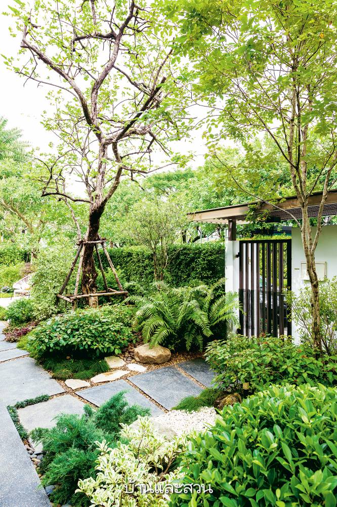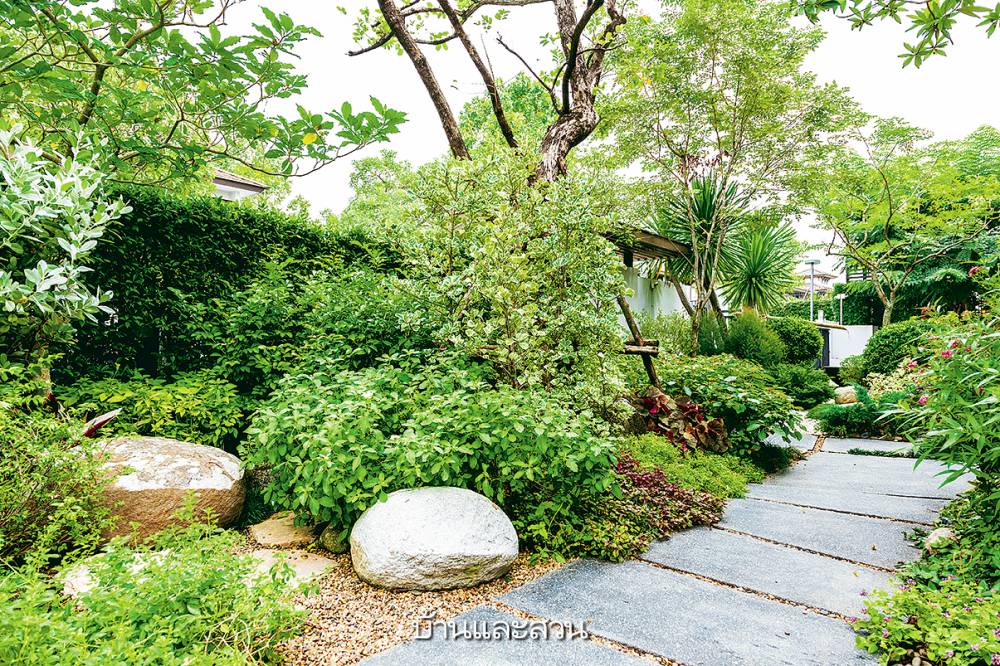 “เนื่องจากรูปทรงของบ้านและเส้นสายต่าง ๆ ภายในสวน ไม่ว่าจะเป็นบ่อปลาหรือทางเดินเป็นเส้นตรง ถ้าเราจัดสวนญี่ปุ่นอีกก็จะดูนิ่งเกินไปครับ ผมเลยออกแบบให้สวนบริเวณด้านในเป็นสวนป่าเมืองร้อนแทน เพื่อให้ดูร่มรื่นตามความต้องการของเจ้าของบ้าน จากบริเวณหน้าบ้านที่ใช้ไม้ตัดแต่งทรงพุ่ม ก็ค่อย ๆ ลดปริมาณไม้ตัดแต่งลง ปล่อยให้ต้นไม้เติบโตมีรูปทรงตามธรรมชาติมากขึ้น ตัดแต่งแค่ไม้พุ่มบางกลุ่ม ค่อย ๆ ปรับสไตล์สวน แต่ส่วนใหญ่เลือกใช้ไม้ใบค่อนข้างเยอะ เพราะต้องการให้สวนสวยได้นาน ไม่โทรม แซมด้วยไม้ดอกเพิ่มสีสัน และแทรกพวกไม้ด่างในบางจุดเพื่อให้มุมนั้นดูสว่างขึ้น ช่วยพรางตาให้รู้สึกว่ามุมสวนนั้นมีขนาดใหญ่กว่าความเป็นจริง”