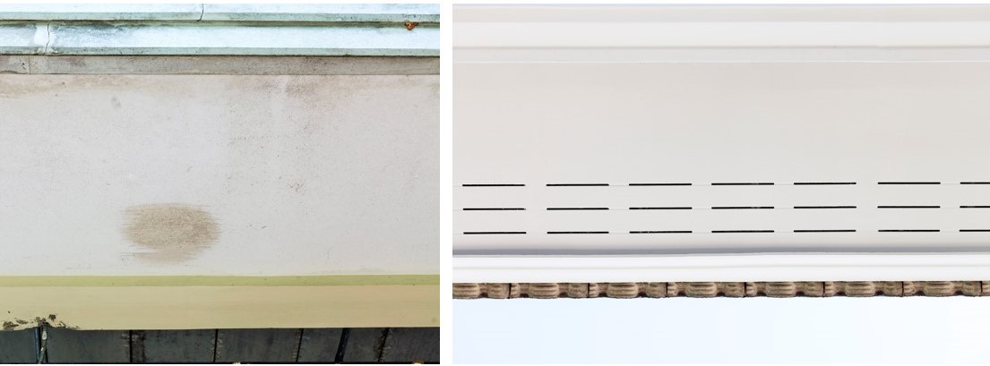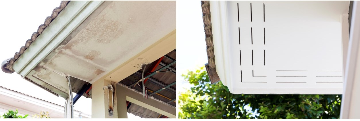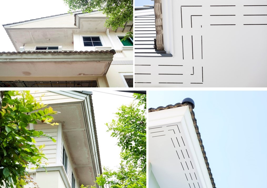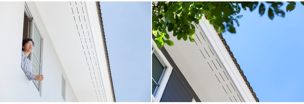 ฝ้าเดิมที่มีร่องรอยความชื้นจากคราบน้ำและไม่มีการระบายอากาศ เมื่อเปลี่ยนฝ้าใหม่สังเกตว่ามีช่องลม ทำให้ได้ฟังก์ชั่นเรื่องระบายความร้อนใต้โถงหลังคา ด้วยการรับลมเย็นเข้ามาแทนที่ ผ่านรูระบายอากาศสำเร็จรูปของฝ้า สมาร์ทบอร์ด เอสซีจี ที่ติดตั้งบริเวณชายคา