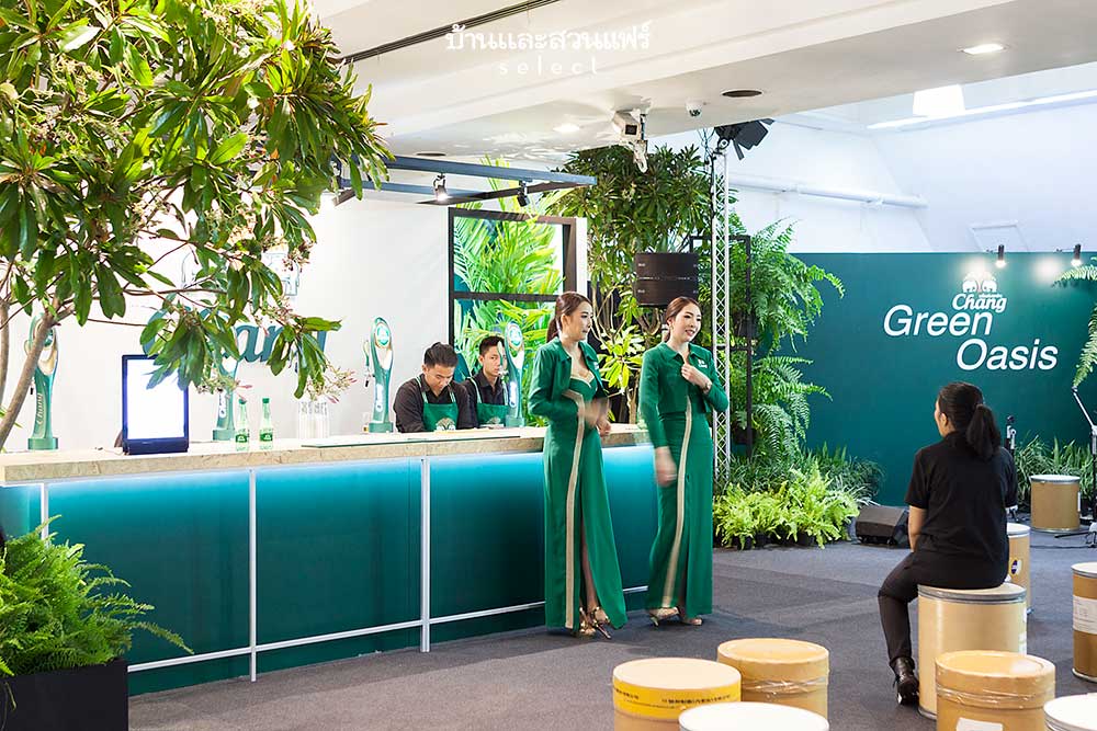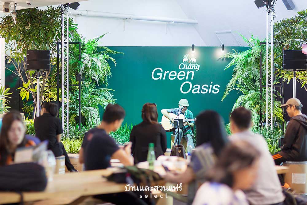 แนวคิดหลักในการออกแบบ Chang Green Oasis ก็เพื่อให้เป็นจุดรวมตัว พบปะพูดคุย และพักผ่อนหย่อนใจ โดยใช้โทนสีเขียวเป็นหลัก ซึ่งให้ความรู้สึกผ่อนคลายตั้งแต่แรกเห็น เสริมด้วยการจัดวางต้นไม้เพื่อให้เกิดความกลมกลืน คล้ายกับเป็นมุมระเบียงในบ้านที่มองออกไปเห็นสวนสีเขียวที่โอบล้อมอยู่ภายนอก และมี Chang Green Bar คอยทำหน้าที่เสิร์ฟความชุ่มชื่นด้วยน้ำดื่มและเครื่องดื่มตราช้าง ช่วยดับกระหายได้เป็นอย่างดี พร้อมยกระดับความผ่อนคลายเพิ่มขึ้นด้วยเสียงดนตรีจากนักร้องและวงดนตรีที่หมุนเวียนมาแสดงกันสดๆ สร้างความเพลิดเพลินให้การนั่งพักเหนื่อย หรือจะเลือกดื่มด่ำกับเครื่องดื่มคุณภาพจาก Italasia ก็ไม่ผิด แถมตอนนี้ยังจัดโปรโปรโมชั่นเร้าใจสุดๆ ด้วย