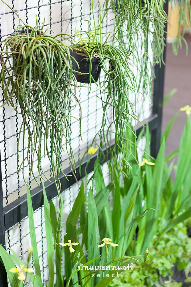 สำหรับไอเดียการจัดวางต้นไม้ในโซนนี้เน้นให้ได้บรรยากาศเหมือนอยู่ริมระเบียงบ้าน เลือกใช้ไม้ใบทรอปิคัลเป็นหลัก เช่น เฟิน ตีนเป็ดน้ำ ไอริสน้ำ หญ้าหนวดปลาดุก ปาล์ม และมีไม้เลื้อยในกระถางแขวนตกแต่งบนแผงตะแกรง ให้อารมณ์เหมือนสวนแนวตั้งสำหรับคนเมือง ซึ่งสามารถนำไอเดียเล็กๆ เหล่านี้กลับไปทำได้เองที่บ้าน