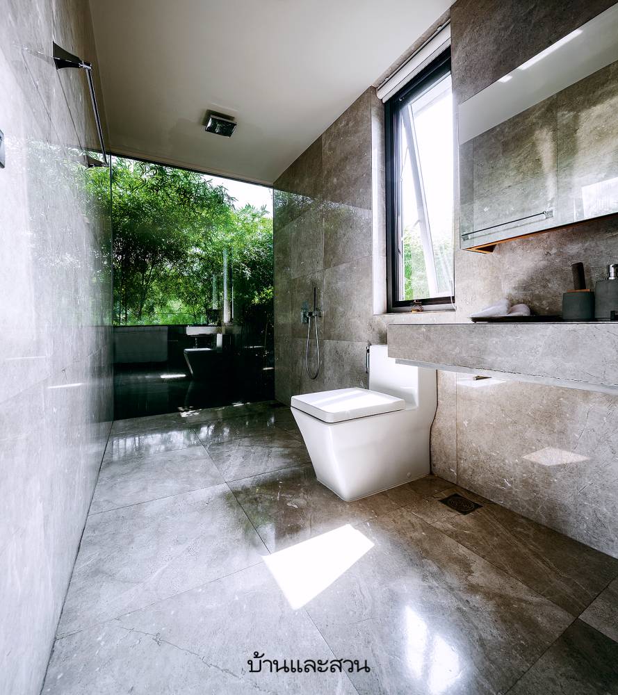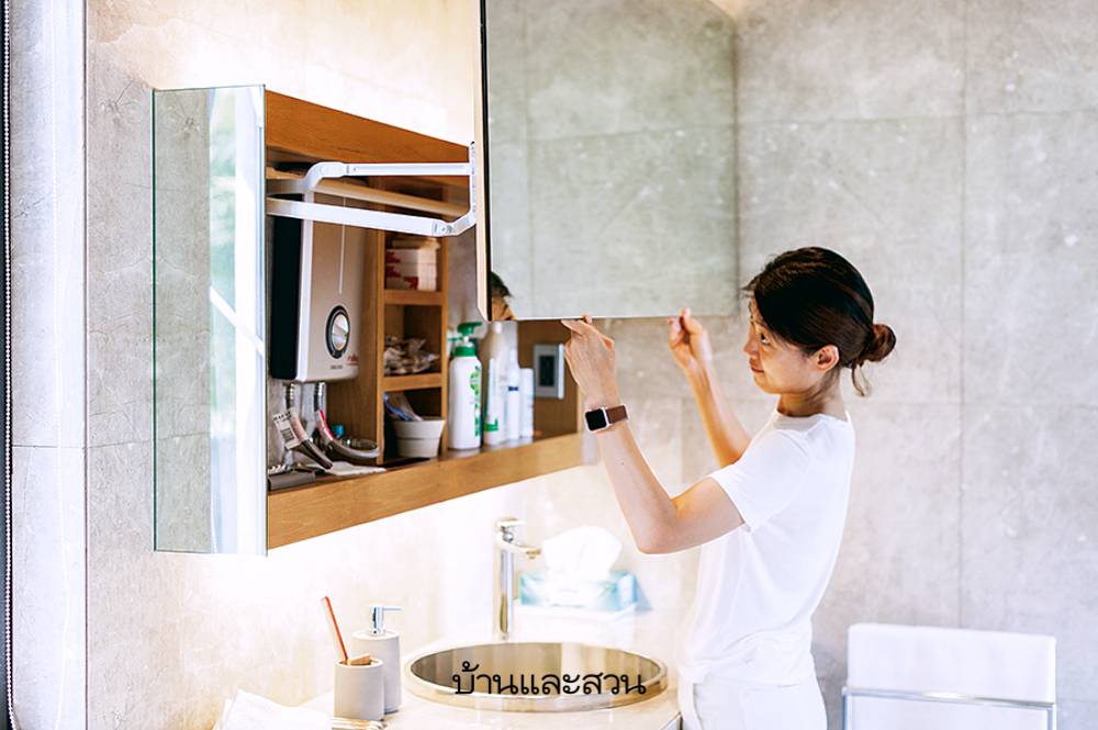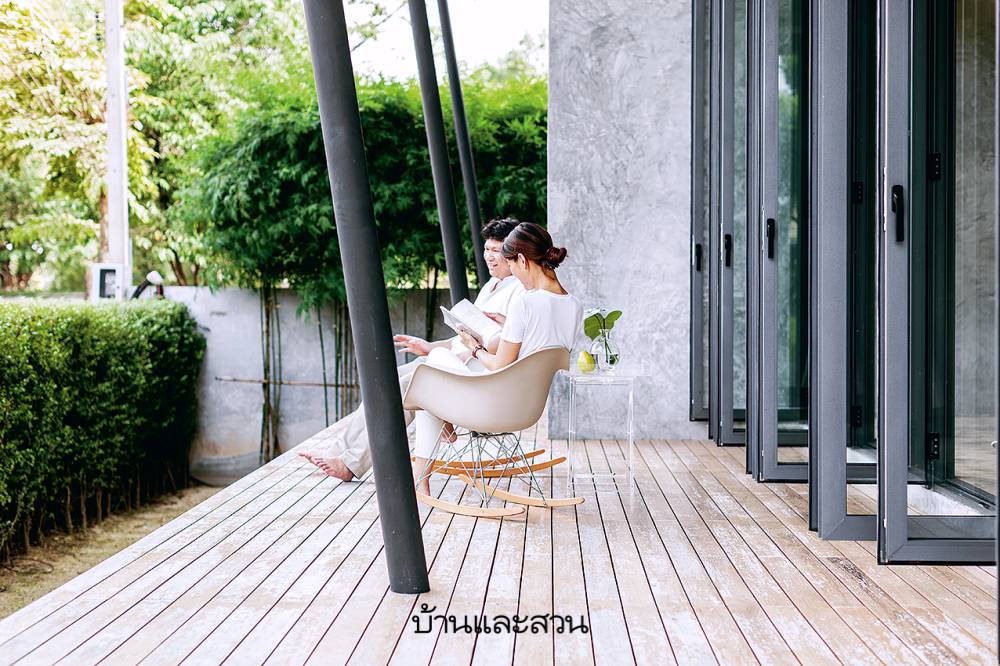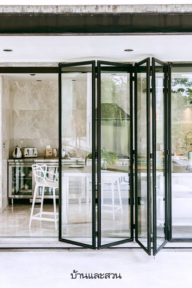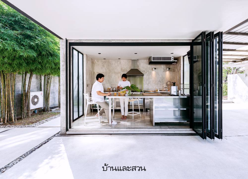 นั่นจึงเป็นเหตุผลว่าทำไมห้องครัวของบ้านถึงเป็นเรือนหลังเล็กที่อยู่ด้านนอกก่อนเข้าบ้าน คุณอูเล่าถึงแนวคิดนี้ว่า “เพราะห้องครัวของบ้านนี้เป็นทั้งห้องรับแขก ห้องนั่งเล่น มุมปาร์ตี้ ห้องทำงาน และห้องอาหาร ซึ่งไม่อยากให้มีปัญหาเรื่องกลิ่นในบ้านด้วย ผมเลยแยกครัวออกมาเป็นเรือนเล็กขนาด 4×3 เมตร ทำประตูบานเฟี้ยมกระจกไว้ด้านหน้าให้เปิดออกกว้างเพื่อถ่ายเทอากาศได้ดี และเจาะช่องแสงด้านข้างช่วยให้ครัวโปร่งสว่างขึ้น เวลามีเพื่อนมาปาร์ตี้ทั้งเสียงและกลิ่นก็จะไม่รบกวนคนที่อยู่ในบ้านเลย”