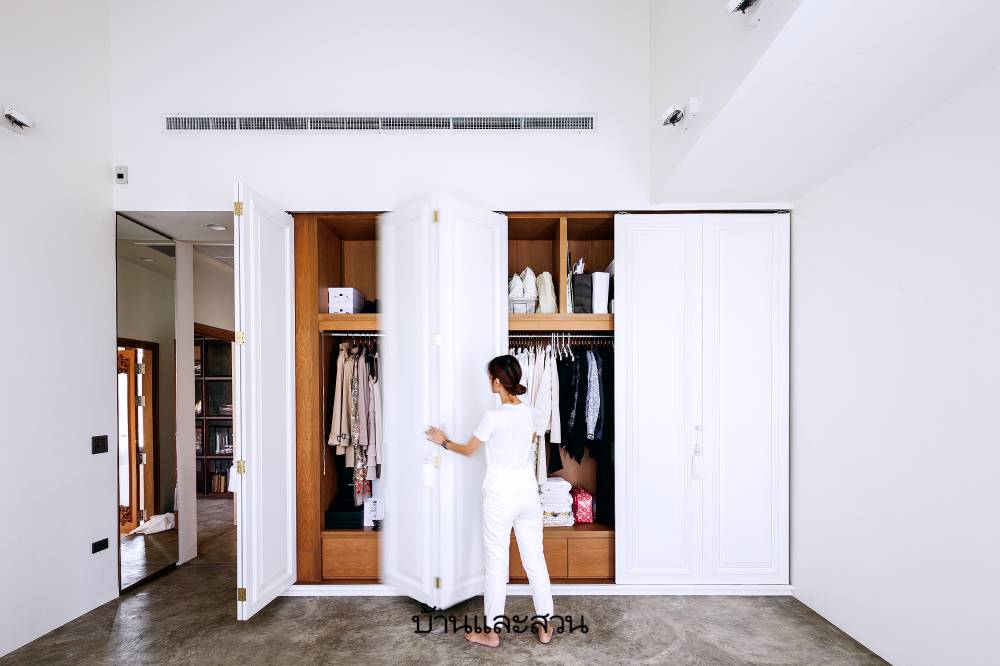 ความรักในมุมมองที่เรียบโล่งยิ่งเห็นได้ชัดที่สุดภายในห้องนอนของคุณกิ๊ฟท์เอง เพราะนอกจากตู้ไม้บิลท์อินกับหน้าบานแบบเลื่อนสีขาวแล้ว ก็มีแค่ฟูกนอนขนาด 3.50 เมตรปูด้วยผ้านวมสีขาววางนิ่งอยู่บนผ้าผืนบางเหนือพื้นปูนเปลือย ภายใต้ฝ้าเพดานสูงที่โชว์เห็นเส้นสายของจั่วจากมุมหลังคา ที่เหลือคือบรรยากาศของความสงบนิ่งและผ่อนคลายอย่างน่าทึ่ง