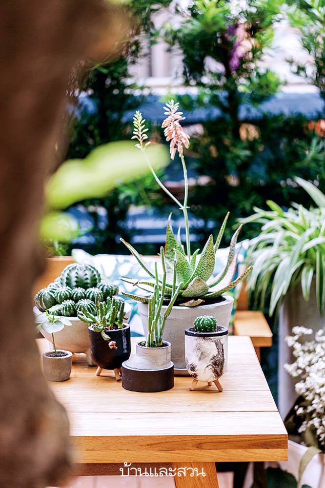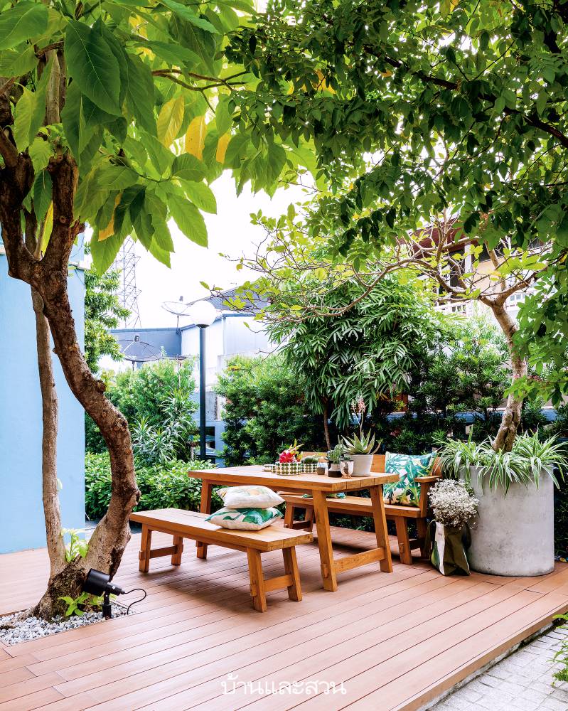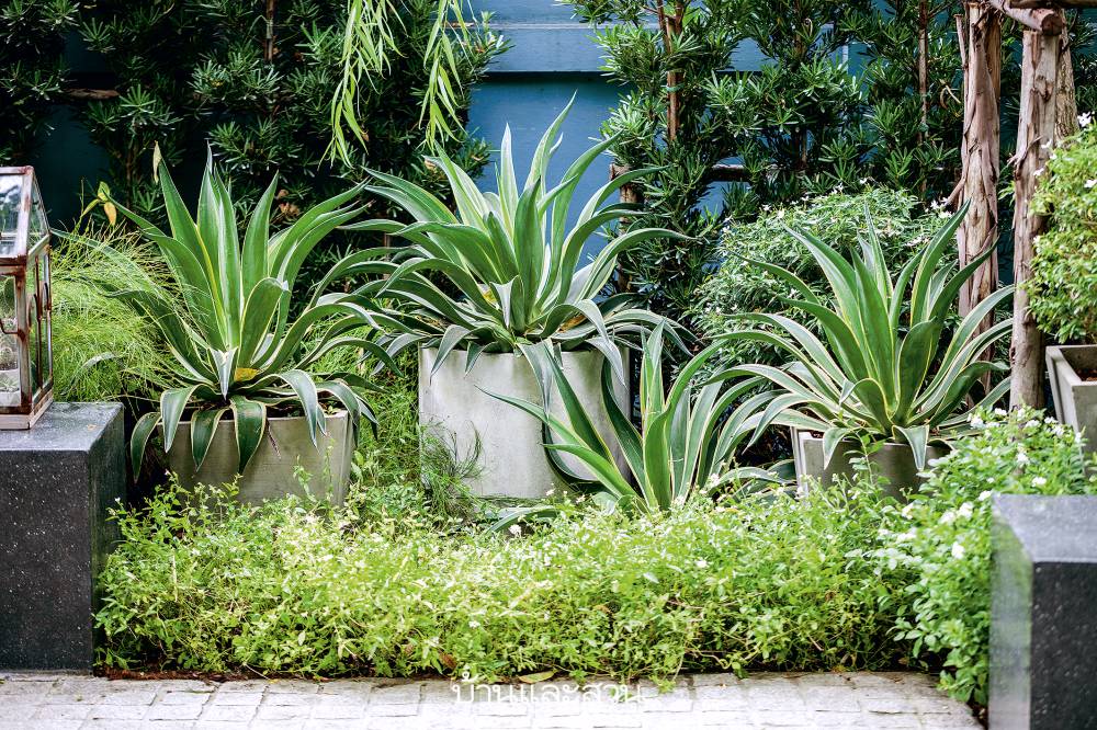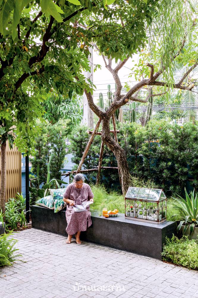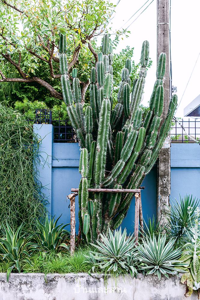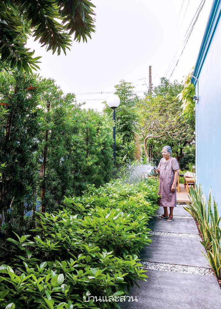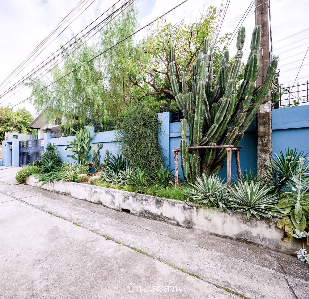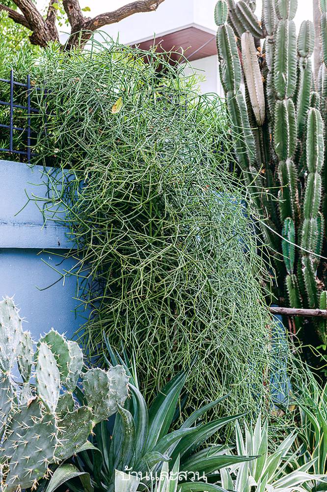 “เมื่อวางองค์ประกอบและฟังก์ชันต่างๆ ของสวนในตำแหน่งที่เหมาะสมแล้ว เราจึงเลือกพรรณไม้มาลงให้เหมาะกับพื้นที่และสไตล์ของสวน เพื่อให้เกิดความร่มรื่น มีชีวิตชีวา และทำให้สวนน่าใช้งานมากขึ้น โดยมีต้นไม้ใหญ่เดิมอย่างแสงจันทร์ ที่ทั้งให้ร่มเงาและทำให้สวนดูสว่างขึ้น นอกนั้นเป็นพรรณไม้ที่ดูแลรักษาง่าย เน้นให้เกิดบรรยากาศที่ดูร่มรื่น เช่น ปลูกสนใบพายเพื่อพรางให้เกิดความเป็นส่วนตัวและสร้างพื้นที่สีเขียวให้สวน แต่มีรายละเอียดที่เพิ่มเข้าไปคือ ปลูกให้ห่างจากแนวรั้ว 50 เซนติเมตร เพื่อให้ง่ายต่อการดูแลรักษา ต้นไม้มีพื้นที่เจริญเติบโต และไม่เป็นปัญหากับเพื่อนบ้านด้วย และด้วยสีของบ้านที่เป็นสีฟ้าสดใส จึงทำให้นึกถึงสไตล์โมร็อกโก เราเลยเลือกปลูกไม้อวบน้ำและแคคตัสที่กระบะบริเวณหน้าบ้าน เพื่อเชื่อมโยงสไตล์ของบ้านและสวนให้ดูกลมกลืนกัน”