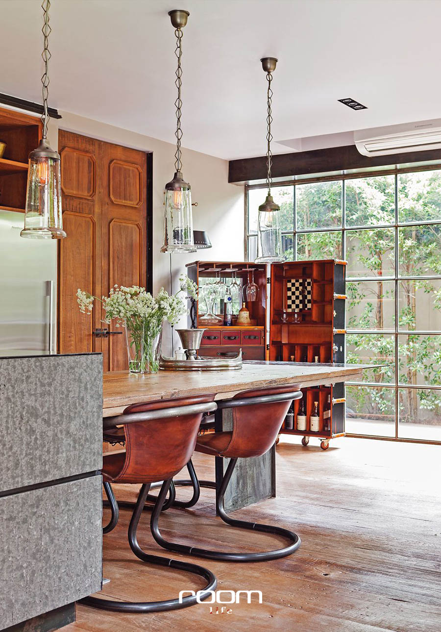 ห้องครัวมีไอส์แลนด์อยู่ตรงกลางเชื่อมต่อกับโต๊ะรับประทานอาหาร การตกแต่งเน้นใช้ไม้เป็นวัสดุหลัก ตั้งแต่พื้น ประตู รวมไปถึงเฟอร์นิเจอร์ต่าง ๆ ช่วยให้ทุกอย่างดูอบอุ่นไม่ดิบจนเกินไป ผนังรอบ ๆ กรุบานกระจกโครงเหล็กให้ความรู้สึกไม่อึดอัดแบบ Open Kitchen ดูโปร่ง ๆ สามารถใช้เป็นมุมนั่งเล่นเอ็นจอยกับเพื่อน ๆ นอกจากนี้ยังสามารถเชื่อมต่อพื้นที่ไปสู่มุมนั่งเล่นในสวนด้านข้าง หรือถ้าอยากเปิดรับลมและอากาศบริสุทธิ์ก็สามารถเลื่อนบานประตูกระจกออกได้