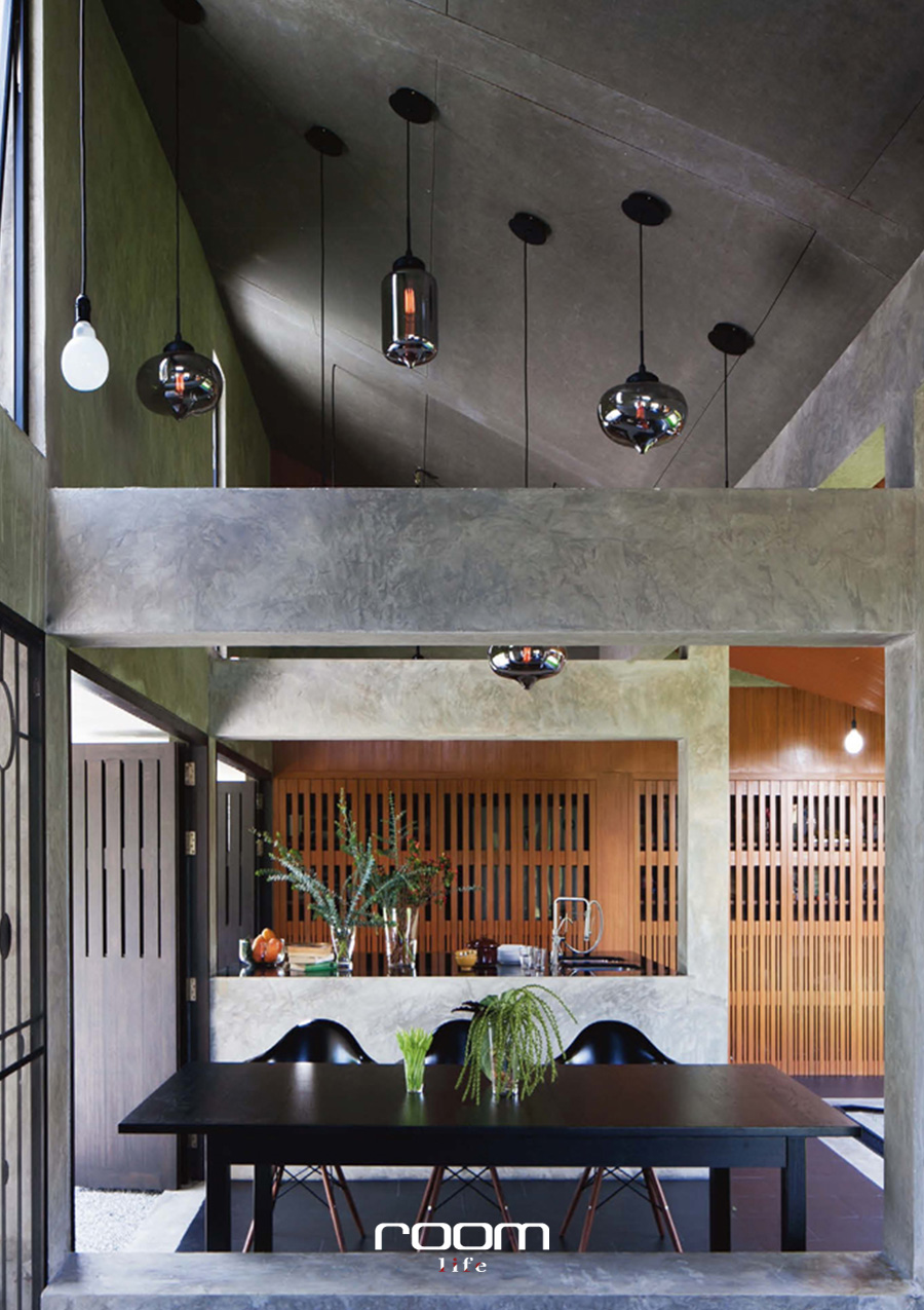 พื้นที่รับประทานอาหารและครัวชั้นล่างคุมธีมด้วยโทนสีเคร่งขรึม พื้นปูนเปลือยขัดมัน จัดวางเฟอร์นิเจอร์สีเข้มเข้ากับเคาน์เตอร์ครัวขนาดเล็กซึ่งมีสีเดียวกัน กั้นพื้นที่ภายในและภายนอกด้วยประตูบานเลื่อนขนาด 2.80 x 7.50 เมตรด้านหน้ามีชานนั่งเล่นปูนเปลือยขัดมันยื่นออกไป 2.45 เมตร ช่วยสร้างความรู้สึกเชื่อมต่อกับสเปซภายในบ้าน