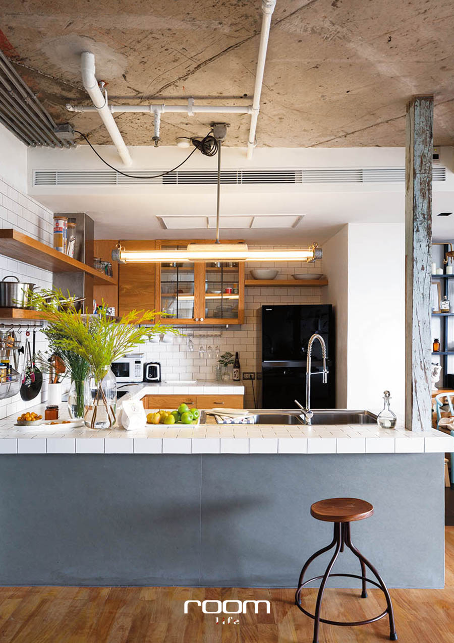 เคาน์เตอร์ทำอาหารบิลท์อินไม้วางขนานไปตามแนวผนัง ส่วนผนังด้านหลังทำตะขอไว้ใช้แขวนอุปกรณ์เครื่องใช้ในครัว และบันไดอะลูมิเนียมที่กลายเป็นพร็อปส์ตกแต่งครัวไปโดยปริยาย อีกทั้งยังหยิบใช้งานได้สะดวก ให้ลุคที่ดูเท่ ๆ