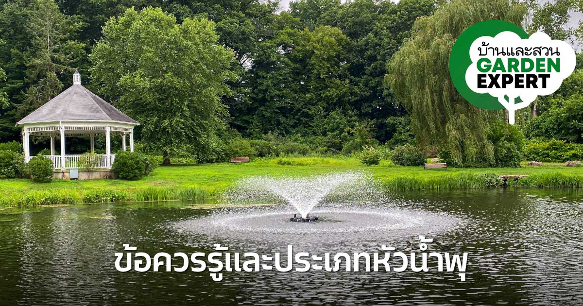 “หัวน้ำพุที่มีขายทั่วไปในท้องตลาดมีให้เลือกใช้หลายรูปทรงและหลายขนาด รวมทั้งรัศมีของน้ำก็มีขนาดแตกต่างกันไป ดังนั้นจึงควรเลือกให้เหมาะกับขนาดของบ่อ รัศมีของน้ำพุไม่ควรใหญ่กว่าบ่อที่รองรับ เพื่อไม่ให้น้ำกระเซ็นออกจากบ่อมากเกินไป รวมทั้งระดับของหัวน้ำพุควรโผล่พ้นน้ำขึ้นมาไม่เกิน 10 เซนติเมตร เพื่อความสวยงาม สำหรับรูปทรงของน้ำพุแต่ละแบบนั้นต่างก็ให้ความสวยงาม และความรู้สึกที่ต่างกัน หรือหากนำหัวน้ำพุหลายแบบมาใช้ผสมกันก็จะได้น้ำพุแบบประติมากรรมที่สร้างจุดเด่นให้สถานที่ได้ รูปทรงของน้ำพุที่นิยมใช้ทั่วไปมีดังนี้