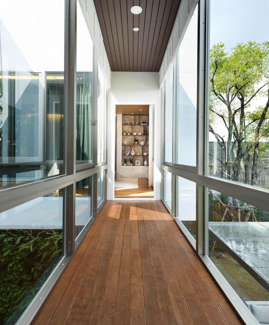 ขณะที่ทุกพื้นที่ภายในบ้านถูกออกแบบให้ตอบโจทย์กับความเป็นส่วนตัว แต่ไม่ทิ้งความเป็นครอบครัวด้วยการสร้างพื้นที่ใช้สอยส่วนกลางไว้ในแต่ละชั้นอย่างลงตัว การดีไซน์ให้บ้านเป็นพื้นที่เปิดโล่ง ไม่แบ่งโซนด้วยกำแพงทำให้รู้สึกโปร่งสบายไม่อึดอัด อีกทั้งยังเพิ่มความโปร่งโดยการใช้กระจกบานใหญ่ระหว่างทางเชื่อมลีฟวิ่งรูมกับมาสเตอร์เบดรูม ช่วยให้บ้านมีความเป็นหยาง เต็มไปด้วยพลังงานที่มีชีวิตชีวาอยู่เสมอ เป็นไปตามหลักฮวงจุ้ยที่ดี ซึ่งจะนำพาความสุขมาให้คนในบ้าน