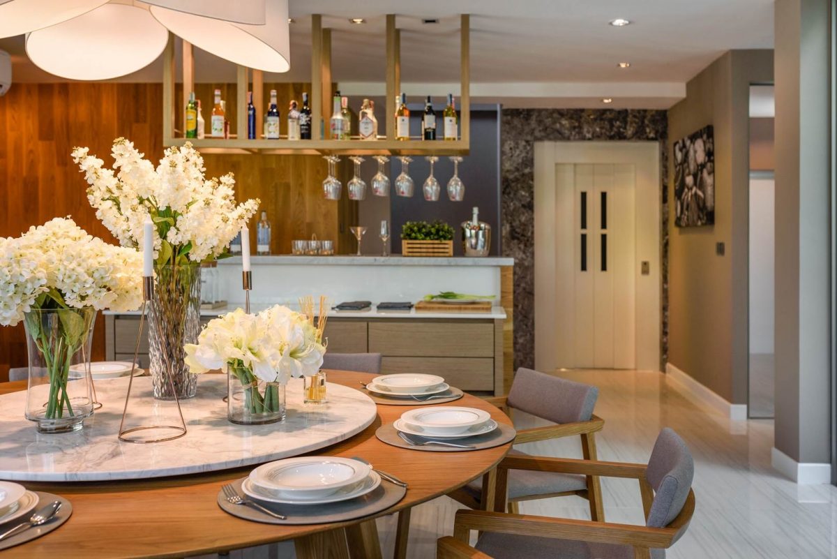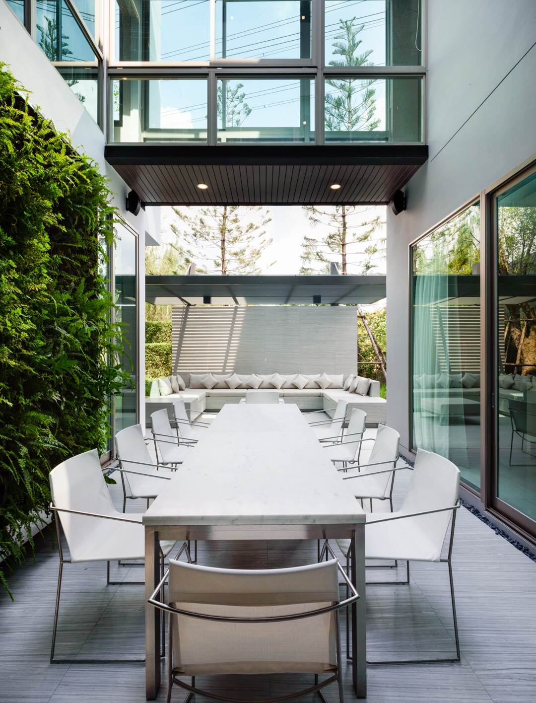 พื้นที่ส่วนหน้าเมื่อเปิดประตูบ้านเข้ามา จะพบกับส่วนรับประทานอาหารและครัวฝรั่ง ให้ทุกคนในบ้านได้มาใช้เวลาร่วมกันอย่างสะดวกสบาย มีส่วนครัวปิดสำหรับแยกเป็นครัวไทยเพื่อให้ง่ายต่อการจัดการกลิ่น และติดตั้งลิฟต์เพื่อความสะดวกมากขึ้น