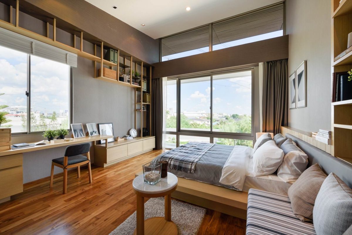 โซนด้านหลังออกแบบเป็นห้องนอน Master Bed โดยเพิ่มฟังก์ชั่นพิเศษเป็นทางเชื่อมไว้ สองด้านติดกระจกใสบานใหญ่มองเห็นวิวสวนเอาต์ดอร์ ห้องนอนมีขนาดใหญ่ แบ่งเป็นโซนเตียงนอน โซนแต่งตัว พื้นที่ทำงานเล็กๆ และห้องน้ำในตัวที่วางอ่างจากุสซีได้สบายๆ