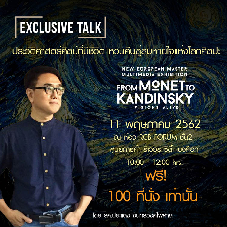 สำหรับนิทรรศการ FROM MONET TO KANDINSKY ‘Visions Alive’ เปิดให้บุคคลทั่วไปได้เข้าชมแล้ว วันนี้ – 31 กรกฏาคม 2562 ณ RCB Galleria (ชั้น 2 ของ ศูนย์การค้าริเวอร์ซิตี้ ) โดย เปิดให้เข้าชมทุกวัน ตั้งแต่เวลา 10.00-22.00 น.