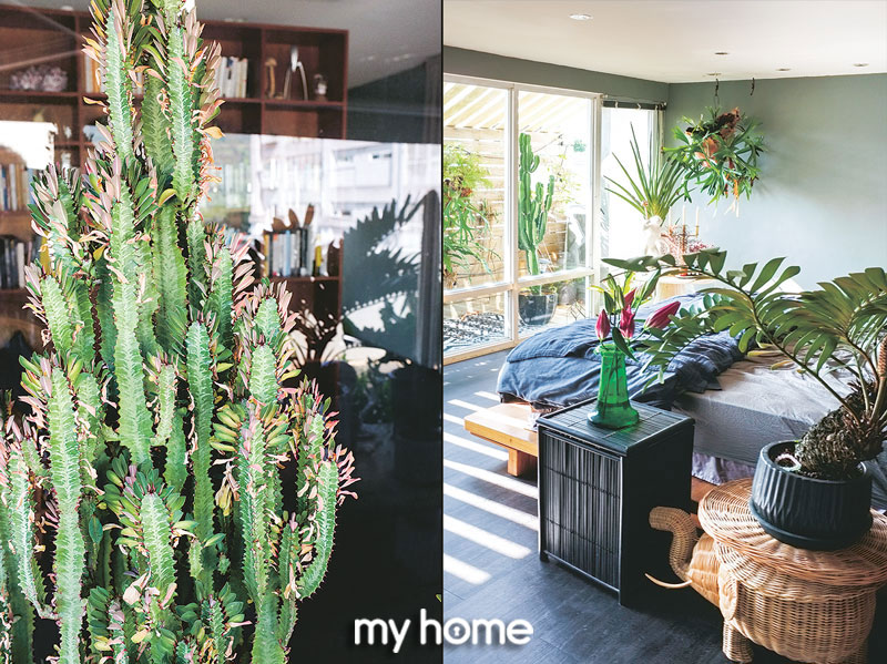 “สองสามปีก่อนผมเดินทางไปที่เกียวโต คนที่นั่นใช้ชีวิตใกล้ชิดกับธรรมชาติ ทำให้ผมเริ่มมองเห็นความเป็นไปได้ที่จะทำบ้านให้อยู่ใกล้ชิดกับธรรมชาติมากขึ้น โดยเริ่มต้นจากมุมว่างๆ ที่ไม่ได้ใช้ประโยชน์ภายในบ้าน” คุณวานเล่า โดยเฉพาะห้องนอนที่อยู่ติดระเบียงด้านหลังบริเวณนี้จะได้รับแสงแดดด้านทิศใต้ตลอดทั้งวันคุณวานเลือกทำผนังระแนงไม้เพื่อกรองปริมาณแสงแดดที่จะเข้าสู่ห้องนอน พร้อมตกแต่งด้วยไม้แขวนที่ชอบแสงแดดรำไรอย่างเฟินกระเช้าสีดากระแตไต่ไม้ เฟินข้าหลวง และเฟินชนิดต่างๆ สร้างความสดชื่นในยามที่คุณวานลืมตาตื่นขึ้นทุกเช้า เขายังไม่ลืมประดับไม้กระถางหรือไม้แขวนในมุมอื่นๆ ของบ้านที่ได้รับแสงแดดเพียงพอ เพื่อดึงความเป็นธรรมชาติให้เข้ามาใกล้ชิดกับชีวิตประจำวันให้มากที่สุด