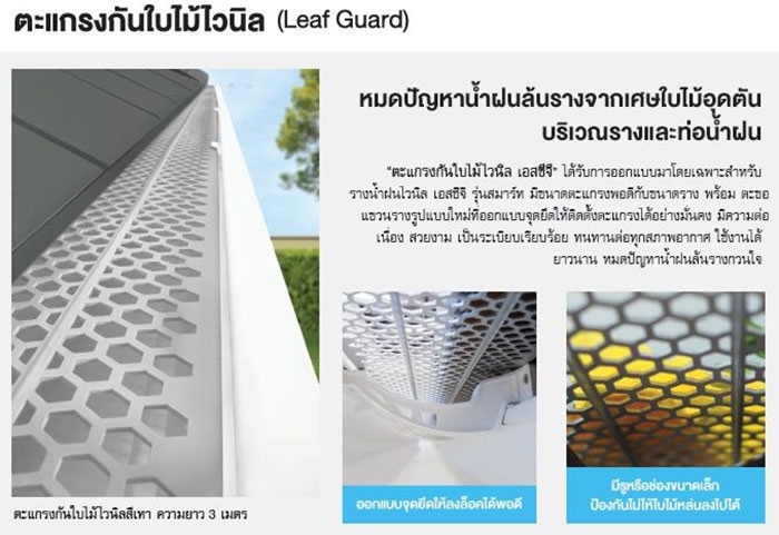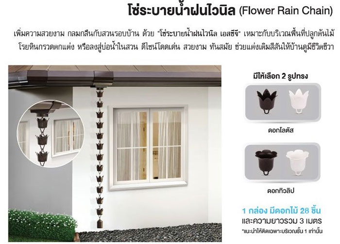 - ข้อดี รางน้ำฝนไวนิลสำเร็จรูป เอสซีจี ได้พัฒนาไวนิลให้เหมาะสำหรับภูมิอากาศประเทศไทยโดยเฉพาะ จึงมีความทนทานสูง มีชิ้นส่วนครบชุดแบบสำเร็จรูป จึงติดตั้งง่าย ทำงานได้ทันที รวดเร็ว และได้มาตรฐาน มีดีไซน์สวยงามเพราะเมื่อติดแล้วจะยาวต่อเนื่องโดยไม่เห็นโครงรับรางน้ำ