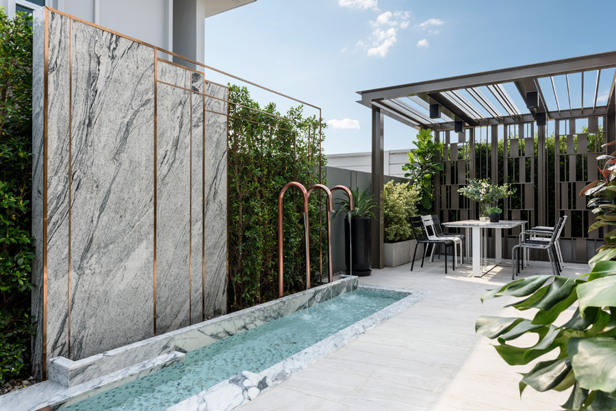 ความหรูหราเริ่มต้นตั้งแต่ประตูทางเข้าโครงการที่ตกแต่งด้วยหินอ่อนนำเข้า และประติมากรรมที่สะท้อนรสนิยมของผู้พักอาศัย มาพร้อมระบบรักษาความปลอดภัย Security gate + Access Card เพื่อความเป็นส่วนตัวของลูกบ้าน พื้นที่ภายในโครงการมีบรรยากาศร่มรื่นด้วยการปลูกต้นไม้ใหญ่ตลอดโครงการ