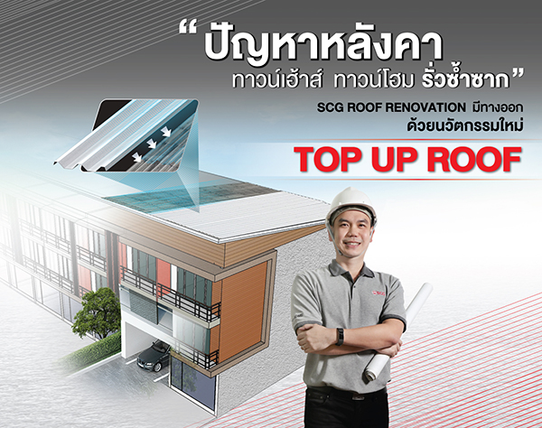 - โซลูชั่น “ไร้กังวล” เพื่อลูกค้าทาวน์เฮ้าส์และทาวน์โฮม ที่มีปัญหาหลังคาเก่ารั่วซ้ำซาก ด้วยนวัตกรรม Top Up Roof จาก SCG Roof Renovation ด้วยการเสริมวัสดุมุงหลังคาปิดจุดรั่ว แบบ Double Protection ลิขสิทธิ์หนึ่งเดียวจากเอสซีจี โดยไม่ต้องรื้อหลังคาเก่าออก ช่วยลดการเกิดฝุ่นจากการทำงาน ในขณะที่เจ้าของบ้านสามารถอาศัยอยู่ในบ้านได้ตามปกติ และมั่นใจด้วยการรับประกันการติดตั้งนาน 1 ปี พร้อมนำเทคโนโลยีดิจิทัลเพิ่มความสะดวกในการสำรวจหลังคา เจ้าของบ้านสามารถประมาณการราคาด้วยภาพถ่ายดาวเทียมด้วยตนเองในเบื้องต้น เพียงเข้าเว็บไซต์ https://raes.scg.com และเจาะลึกการสำรวจหน้างานด้วยเทคโนโลยีโดรนที่ช่วยให้เห็นสภาพหลังคาตลอดจนทำการวิเคราะห์และประมาณการหาโซลูชั่นที่เหมาะสมได้อย่างรวดเร็ว ทั้งนี้ ในส่วนของ “สินค้า” เอสซีจี ได้พัฒนาการแก้ปัญหากระเบื้องหลังคาสีซีดจาง ด้วย “เทคโนโลยีหยุดเวลา” ของกระเบื้องหลังคาที่มีหลากหลายระดับความทนทานของสี เพื่อหลังคาสีสวยทนนาน อาทิ หลังคาเอสซีจี รุ่น Celica Curve หลังคาคอนกรีต เอสซีจี รุ่น Prestige X-Shield และหลังคาคอนกรีต เอสซีจี รุ่น ซีแพค