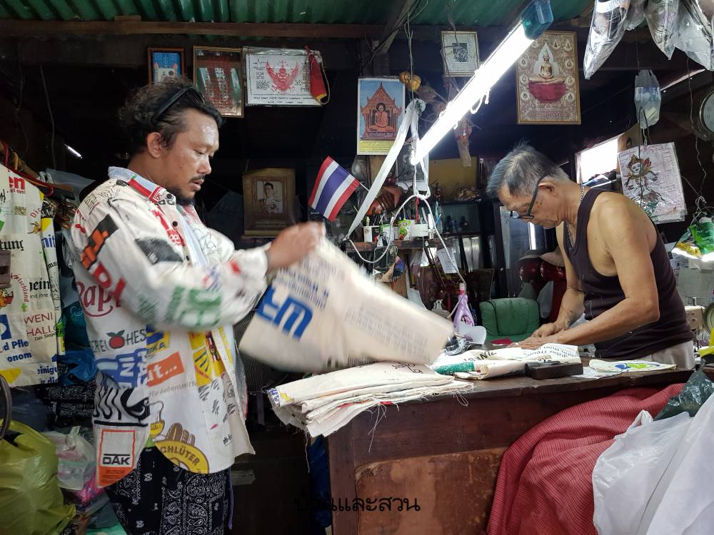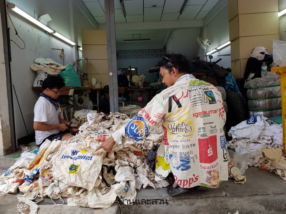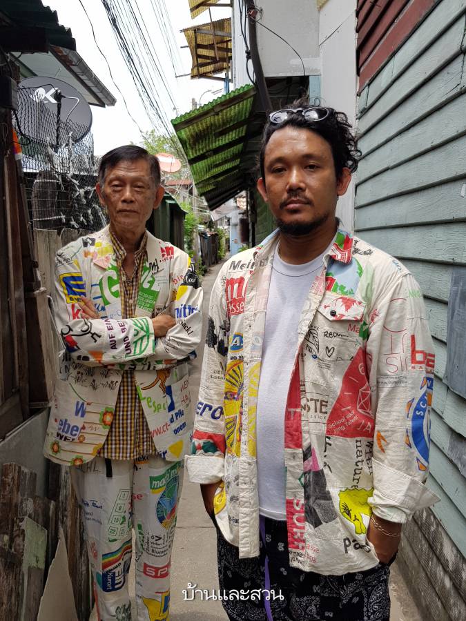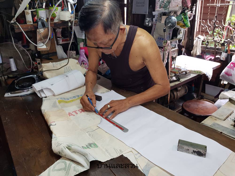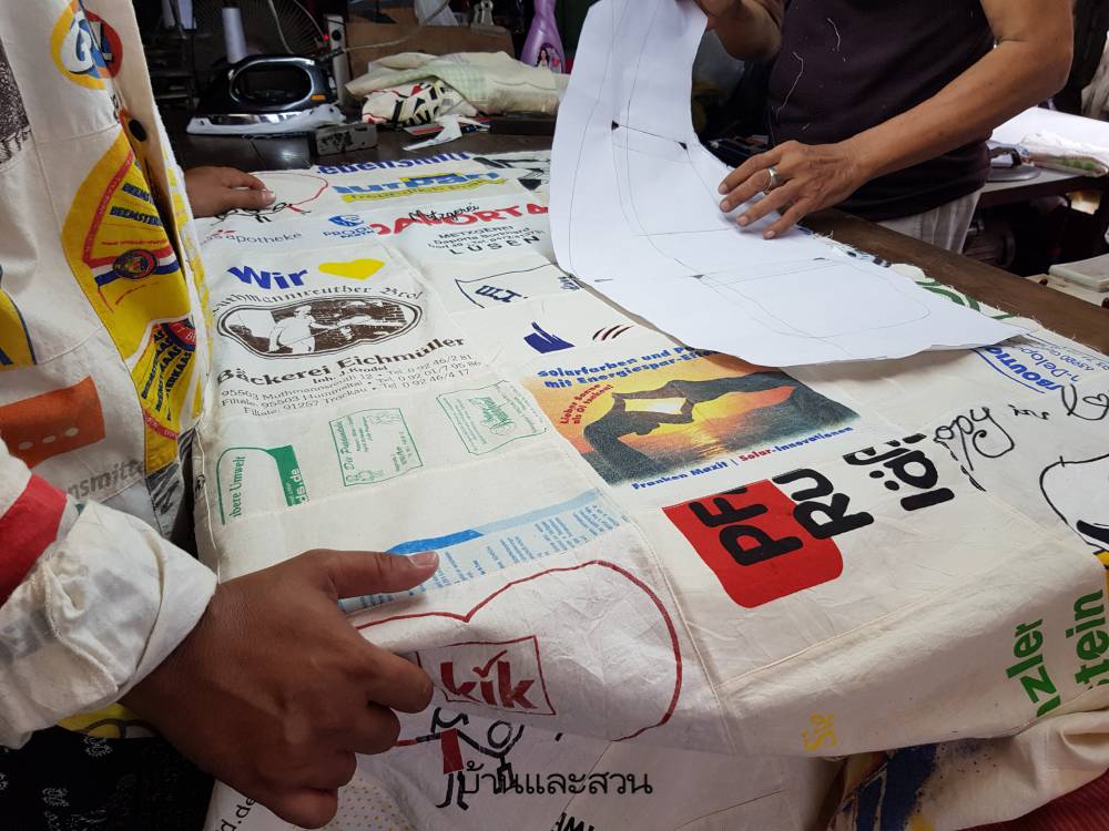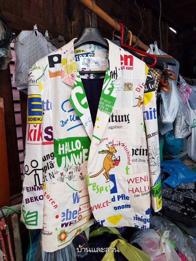 “ถ้าถามผมว่าทำไมถึงเลือกใช้วัสดุมือสอง ผมมองว่าผู้ผลิตส่วนใหญ่มักใช้วัสดุใหม่ๆ ใช้ของใหม่ ผมจึงคิดว่าทำอย่างไรเพื่อไม่ให้เหมือนคนอื่น เริ่มต้นตั้งแต่การผลิตชิ้นงาน ผมจะเลือกถุงผ้ามาสิบใบที่มีลวดลายไม่เหมือนกัน เมื่อนำมาตัดเย็บก็จะคงไว้ซึ่งบุคลิกและเอกลักษณ์ของแต่ละชิ้นงาน การจัดวางลายผ้าก็ต้องคิดให้แตกต่างจากคนอื่น เชื่อไหมว่าคนที่ต่อผ้าให้ผมนี่จัดว่าเป็นนักออกแบบคนหนึ่งได้เลยนะ เพราะผมให้อิสระพวกเขาในการวางลายผ้าเอง ส่วนผมวางแพตเทิร์นและโทนสี มีหลายคนถามผมว่าไม่ได้จบด้านศิลปะมาจะมีผลอะไรกับการทำงานเสื้อผ้าไหม เพราะสิ่งที่ผมทำเกี่ยวข้องกับศิลปะแทบจะทุกกระบวนการ ตอบได้เลยครับว่าไม่มี ผมคิดว่าถ้าทุกคนหาตัวเองเจอ รู้ว่าตัวเองรักชอบอะไร เวลาทำออกมามันก็จะดีเสมอ อีกอย่างการที่ไม่ได้เรียนด้านการออกแบบมาทำให้ไม่มีกฎเกณฑ์มาบังคับในงานของผม