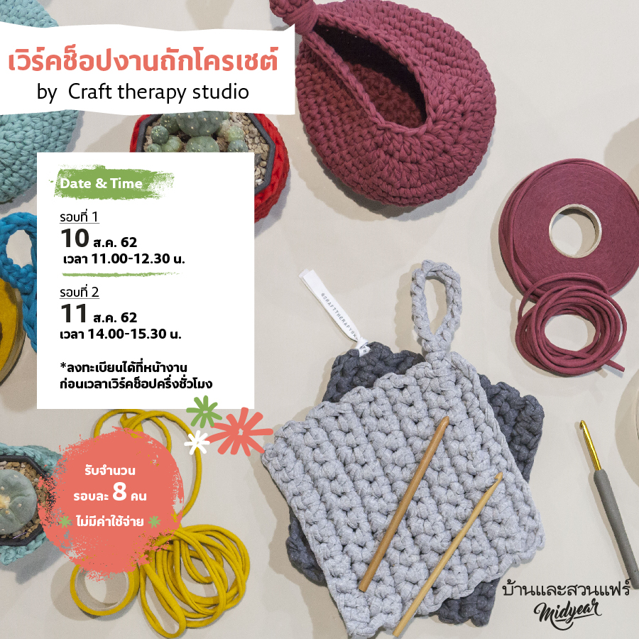 Workshop “ถักโครเชต์” ถักโครเชต์เบื้องต้นด้วยเชือกผ้ายืดที่ทำง่าย ใช้เวลาไม่นาน เป็นพื้นฐานในการขึ้นทรงสิ่งของต่างๆ ผ่านการทำของใช้ในบ้านที่สามารถนำไปต่อยอดได้ สัมผัสช่วงเวลาในการถักโครเชต์ที่จะช่วยบำบัดจิตใจของเรา