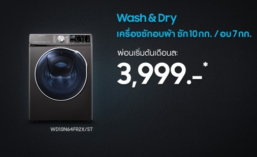 Wash & Dry เครื่องซักผ้าพรีเมี่ยม ที่ซักผ้าหลากหลายได้อย่างครบวงจร สามารถรองรับการซักผ้าได้ทุกประเภท ทั้งเนื้อผ้าบอบบาง จนถึงเสื้อผ้าทั่วไป แถมยังใส่เสื้อผ้าเพิ่มเติมได้ทุกเมื่อ ผ่อนเริ่มต้นเดือนละ 3,999 บาท นาน 10 เดือน
