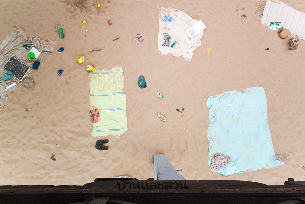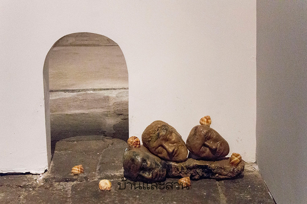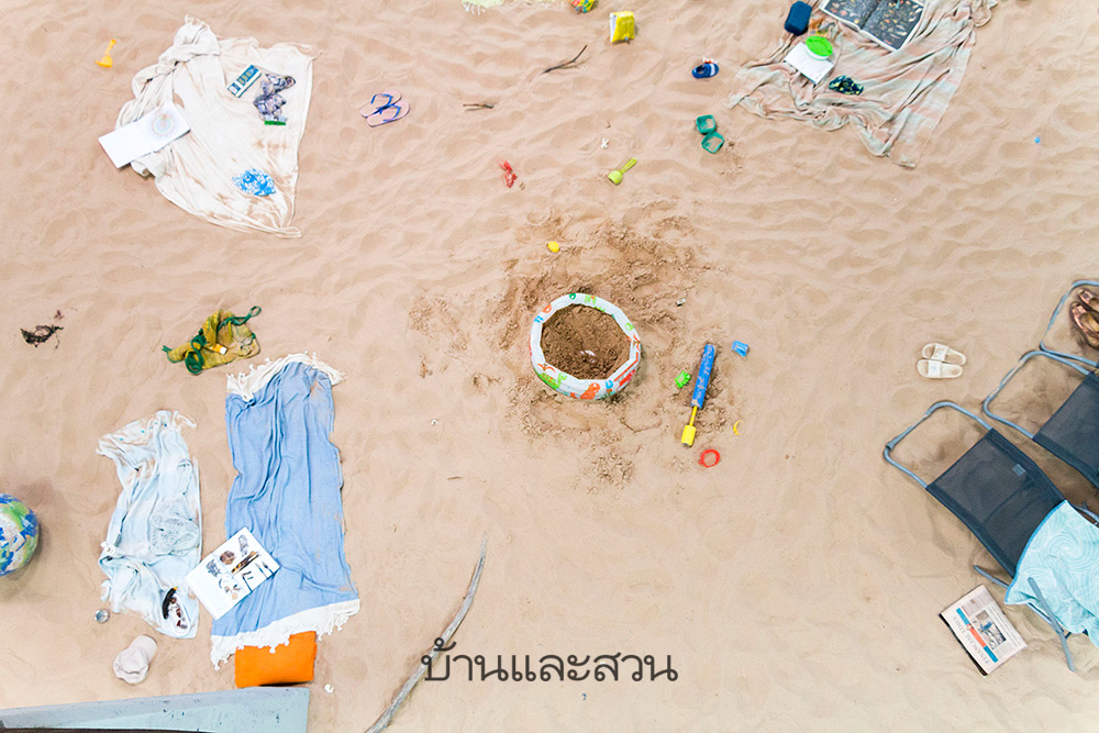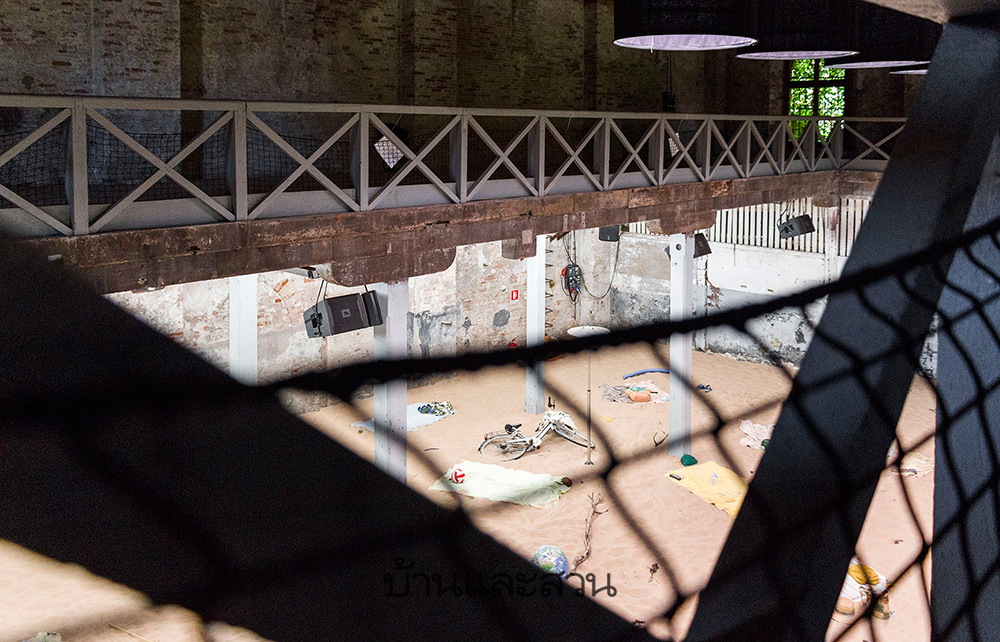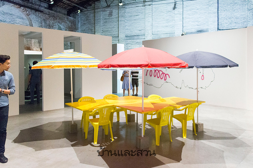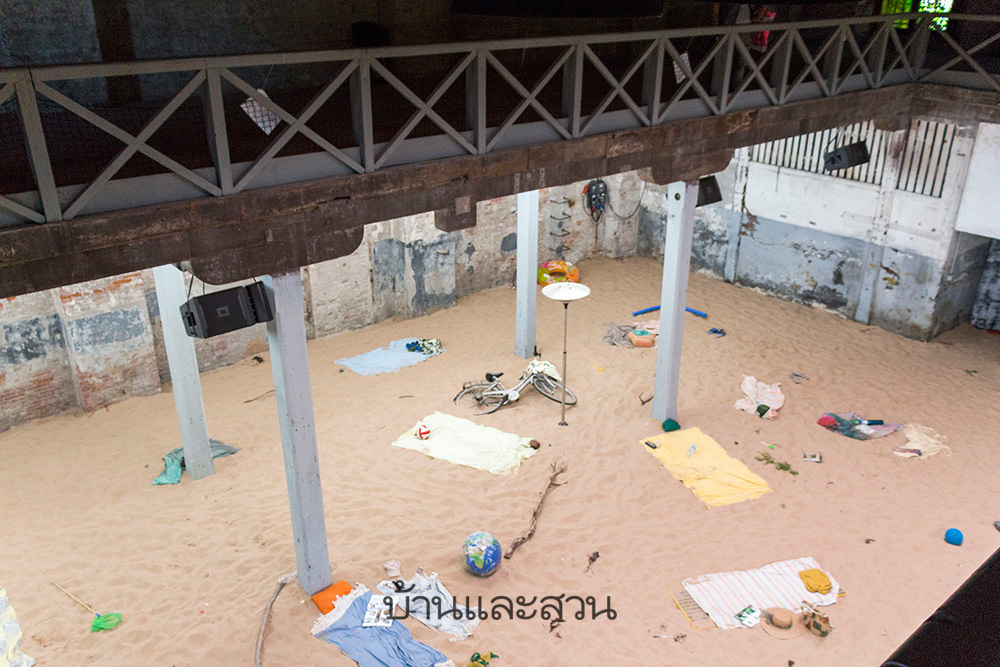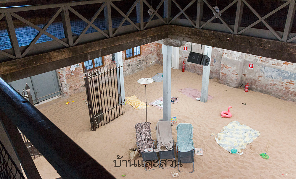 อาคารริมน้ำ Marina Militare Complex ซึ่งอยู่ติดกับบริเวณ Aresenale ซึ่งหากมองจากภายนอกแล้วลักษณะอาคารไม่ได้แตกต่างจากอาคารทั่วๆไปในเวนิส แต่เมื่อเข้าไปชมงาน เราต้องตะลึงกับเมื่อได้เห็นหาดทรายจำลอง พร้อมข้าวของเครื่องใช้ต่างๆติดตั้ง ไว้ชั้นที่ล่าง โดยผู้ชมงานจะมองลงมาได้แบบ Bird Eyes View บ้านและสวน ได้สอบกับเจ้าหน้าที่ดูผู้ดูแลผลงานศิลปะชิ้นนี้ ทำให้เราทราบว่า ผลงานชิ้นจริงๆแล้วคือสถานที่การแสดงศิลปะการแสดงสด โดยทุกวันพุธ และ เสาร์ จะมีนักแสดงราว 20 ชีวิต มาร้องเพลงแสดงโอเปรากันแบบสดๆ ในอริยาบถแบบเที่ยวชายหาด ไม่ว่าจะนอนเองกายอยู่บนเก้าอี้ชายหาด นั่งก่อกองทราย หรือ นอนคุยกัน ส่วนวันไหนที่ไม่มีการแสดง เราก็จะได้เห็นร่องรอยของการแสดง ประกอบทำนองเพลงที่ใช้ในการแสดงสด(ในรูป) ซึ่งเป็นอีกอรรถรสหนึ่งของการชมผลงานศิลปะนี้