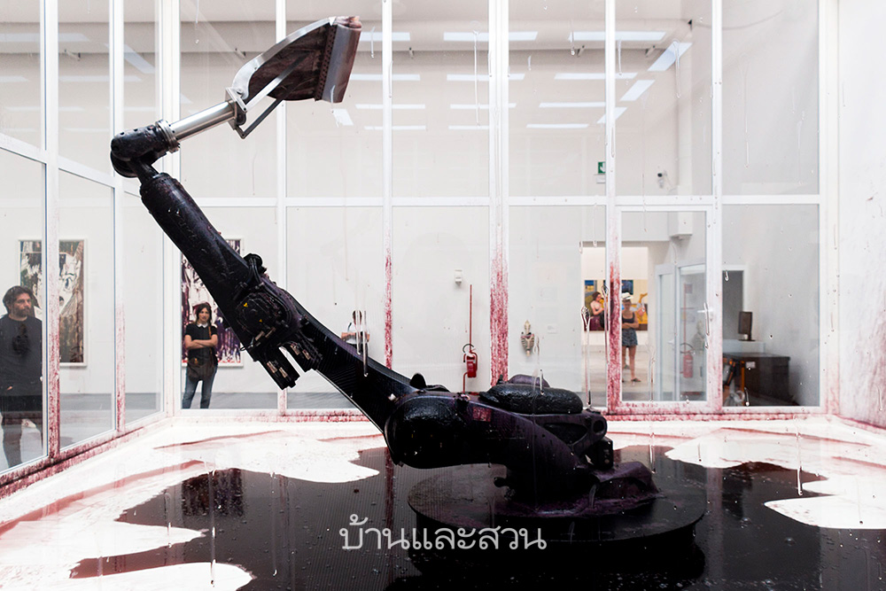 ผลงาน “Can’t Help Myself (2016)” แขนเครื่องจักรกลที่บริเวณมีลักษณะคล้ายกับแปรงขนาดใหญ่ ซึ่งผลงานชิ้นนี้ขยับและสะบัดของเหลวสีเลือดไปรอบๆ ในรูปแบบการเคลื่อนไหวแบบสุ่มที่ได้ถูกโปรแกรมไว้ 32 แบบ ซึ่งสองศิลปินผู้สร้างผลงานนี้ก็ไม่ใช่ใครทื่ไหน Sun Yuan and Peng Yu ผู้สร้างผลงาน Dear (2015) ที่บริเวณ Arsenale นั้นเอง