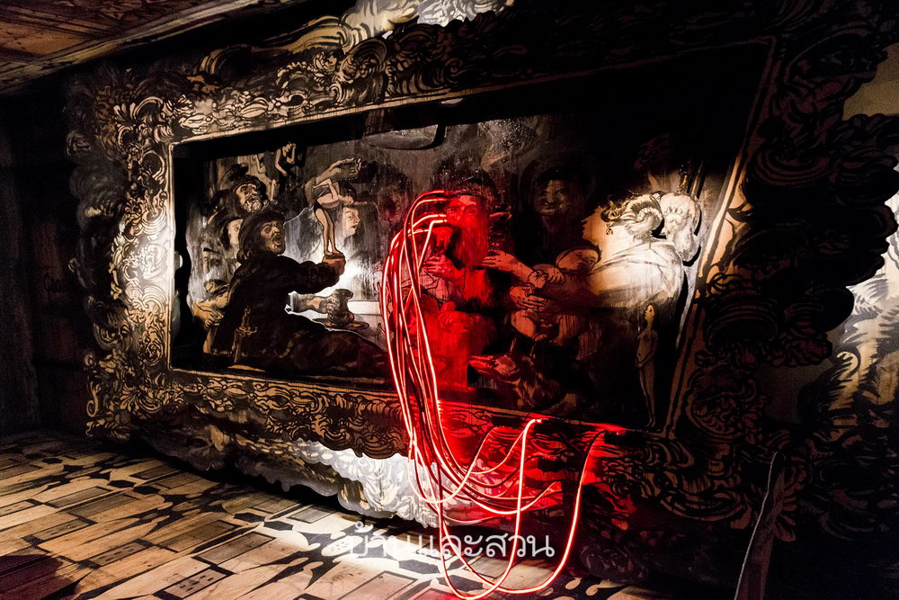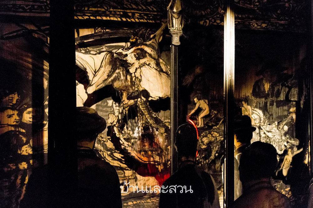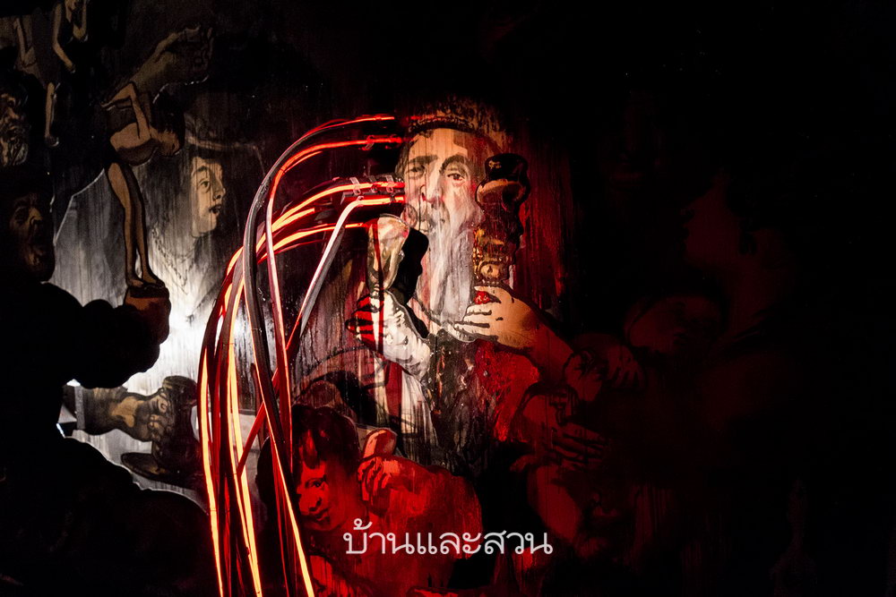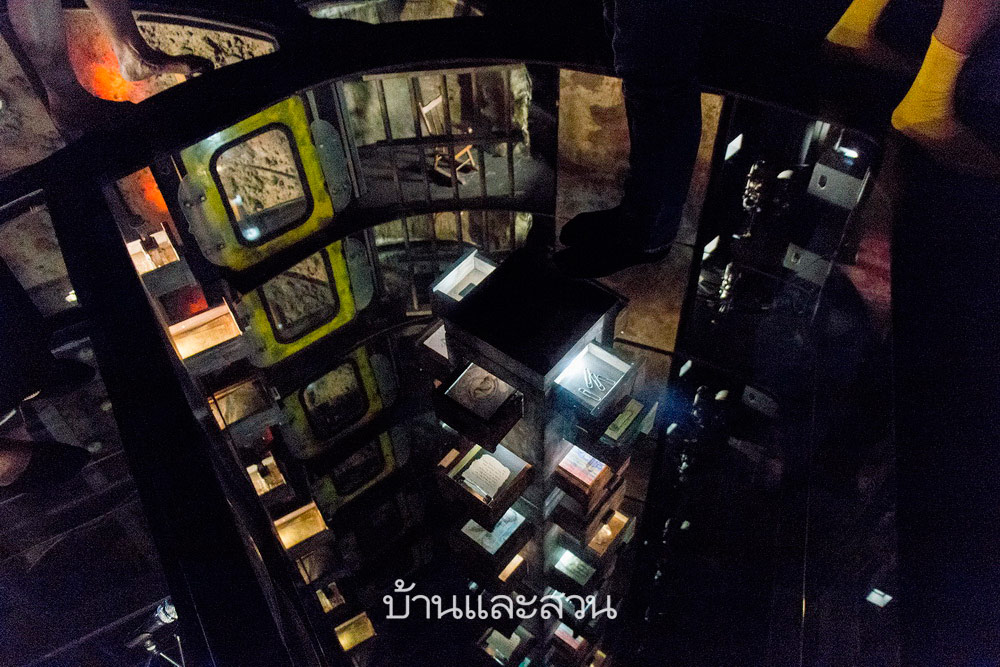 ขณะที่เรากำลังชมผลงานอยู่นั้น อยู่ๆทั้งห้องก็กลายเป็นสีแดง ไฟไซเรนหมุนรอบได้เปิดขึ้น และ การแสดงของหุ่นกลไกที่ติดตั้งไว้ก็ทำงาน เราได้เก็บภาพการแสดงแบบเต็มๆเกือบ 4 นาที มาให้ทุกท่านชมกัน