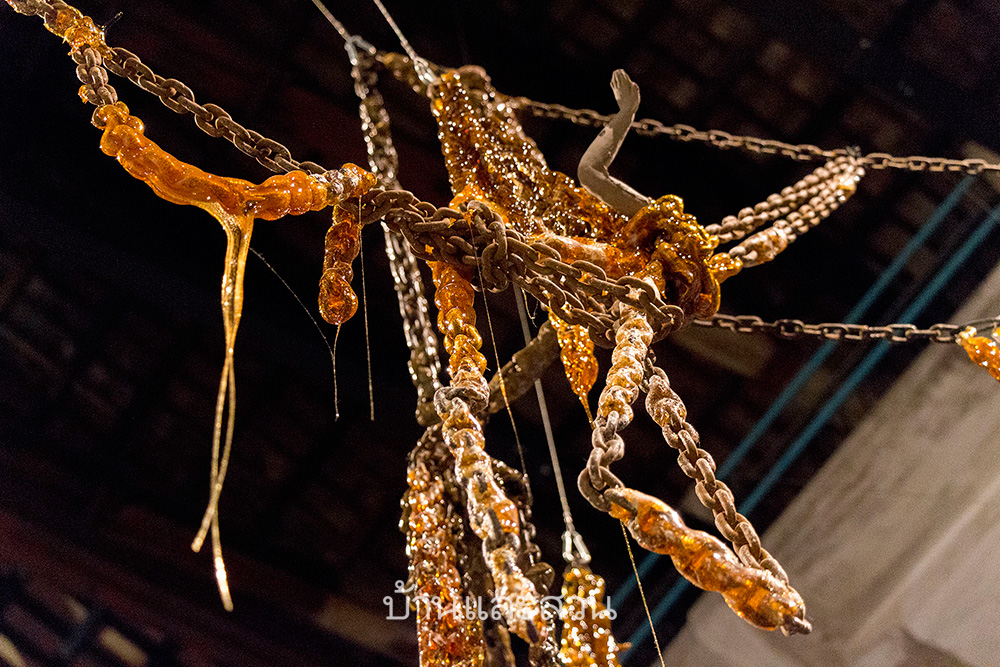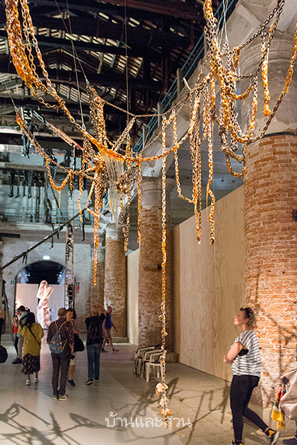 ต่อมาเราได้พบกับ สายโซ่หลายเส้นที่ห้องระโยงระยางมาจากด้านบนโกดังของ Arsenale ซึ่งบนโซ่นั้ันมีสิ่งที่คล้ายของเหลวสีน้ำผึ้งกำลังหยดไหลย้อยลงมา แต่หากสังเกตุดีๆ ….รูปทรงของสิ่งที่ไหลย้อยลงมานั้นกลับนิ่งอยู่กลางอากาศ…มันคืออะไรกันแน่ ไปชมคลิปพร้อมๆกันครับ