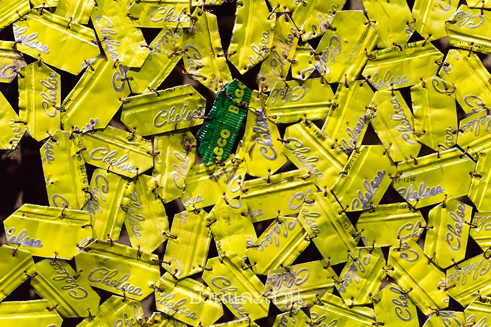 ปีนี้เป็นปีแรกที่ Ghana ได้เข้ามาร่วมเปิด Pavilion ใน เวนิส เบียนนาเล่ และ ได้เลือกหยิบยกเรื่องราวเกี่ยวกับการต่อสู้เพื่ออิสรภาพในประเทศ โดยได้ตั้งชื่อนิทรรศการจากชื่อเพลงของ E.T. Mensah ที่ แต่งไว้เพื่อฉลองการประกาศเอกราชเมื่อปี ค.ศ. 1957 โดยโซนที่เป็น Highlight ของ Pavilion นี้คือห้องที่อุทิศให้กับงานของ El Anatsui ศิลปินระดับตำนานของชาว Ghana วัย 75 ปี ได้ที่ได้สร้างประติมากรรมจัดวางขนาดใหญ่จากแผ่นฟอยล์ที่ไว้คุ้มขวดไวน์มาสานต่อกันด้วยลวดทองแดง จึงทำให้ได้ผลงานตระกานตาอย่าง “Opening of Time” 2019 ที่ใช้แผ่นฟอยล์ฝาขวดเครื่องดื่มยี่ห้อ Chelsea ซึ่งจากที่เราได้พูดคุยกับเจ้าหน้าที่ประจำ Pavilion เขาคิดว่าเครื่องดื่มยี่ห้อนี้น่าจะเป็นยี่ห้อแรกๆที่นำเข้ามาจากต่างประเทศ และได้พัฒนาเป็นอุตสาหกรรมการผลิตขวด และ บรรจุขวดในประเทศต่อมา โดยเขาเองก็ไม่แน่ใจว่าฝาขวดที่ใช้ทั้งหมดในงานนี้มีจำนวนเท่าไร แต่น่าจะอยู่ในหลักหมื่นชิ้น นอกจากนี้ภายในห้องเดียวกัน ยังมีผลงานลักษณะเดียวกัน(แต่ขนาดเล็กกว่าเล็กน้อย) อีก 2 ผลงาน