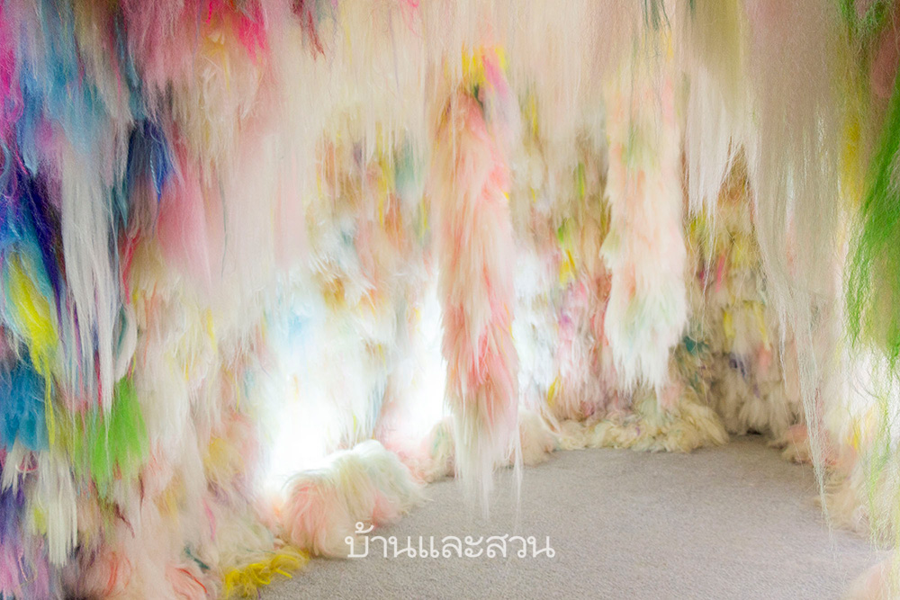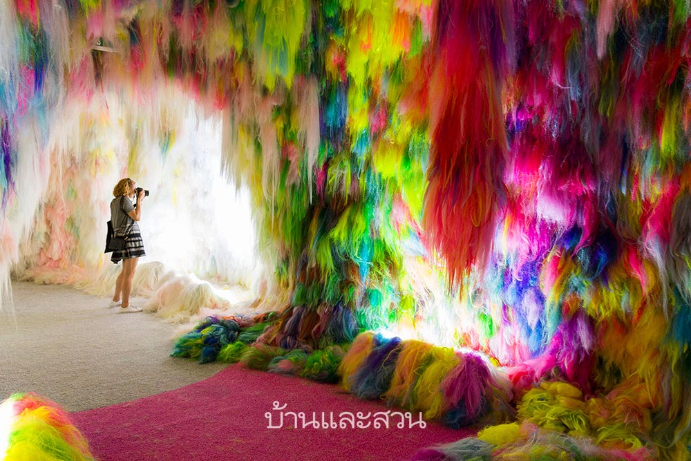 จาก Giardini นั่งเรือข้ามมาที่เกาะ Giudecca เราจะได้พบกับผลงานของศิลปิน Hrafnhildur Arnardóttir หรือ Shoplifter ที่เปลียนโฉมของโกดังเก่าที่แต่เดิมเอาไว้เก็บเบียร์และไวน์ ให้เป็นโลกภายในของพุงสัตว์ประหลาด ซึ่งมีลักษณะคล้ายกับถ้ำที่เพดาน และ ผนังรอบด้าน ตกแต่งไปด้วยเส้นขนสังเคราะห์หลากสีสัน อีกท้ังภายในพุง ยังเปิดเสียงเพลงบรรเลงที่ฟังแล้วให้ความรู้สึกประหนึ่งอยู่ในแดนสนธยา แถมในบางจังหวะยังมีเสียงทุ้มใหญ่ราวกับเจ้าสัตว์ประหลาดตัวมหึมากำลังกระแอมอยู่ในลำคอ