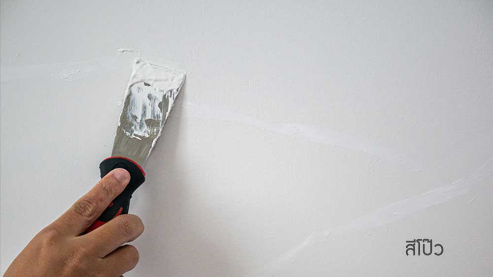 2. อุดโป๊วเก็บตามบริเวณรอยแตกลายงา ด้วยสีโป๊ว นิปปอนเพนต์ วอล พัตตี้ ขัดให้เรียบ แล้วทิ้งให้ผนังแห้งสนิท