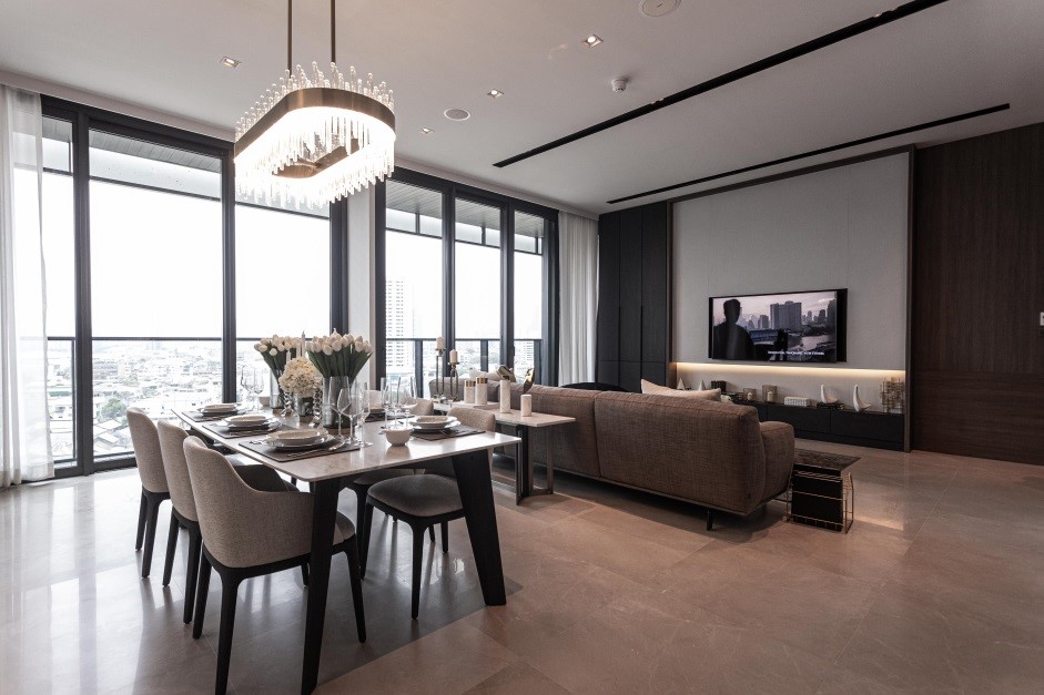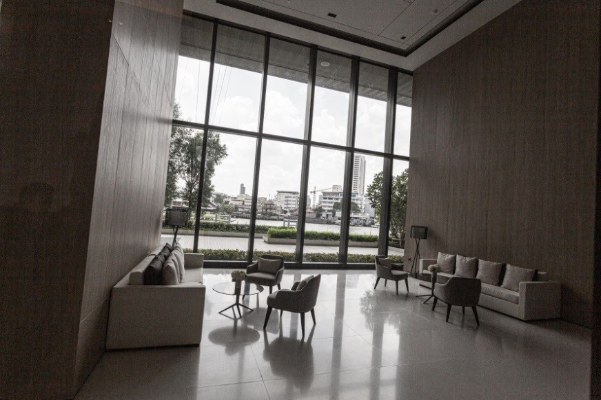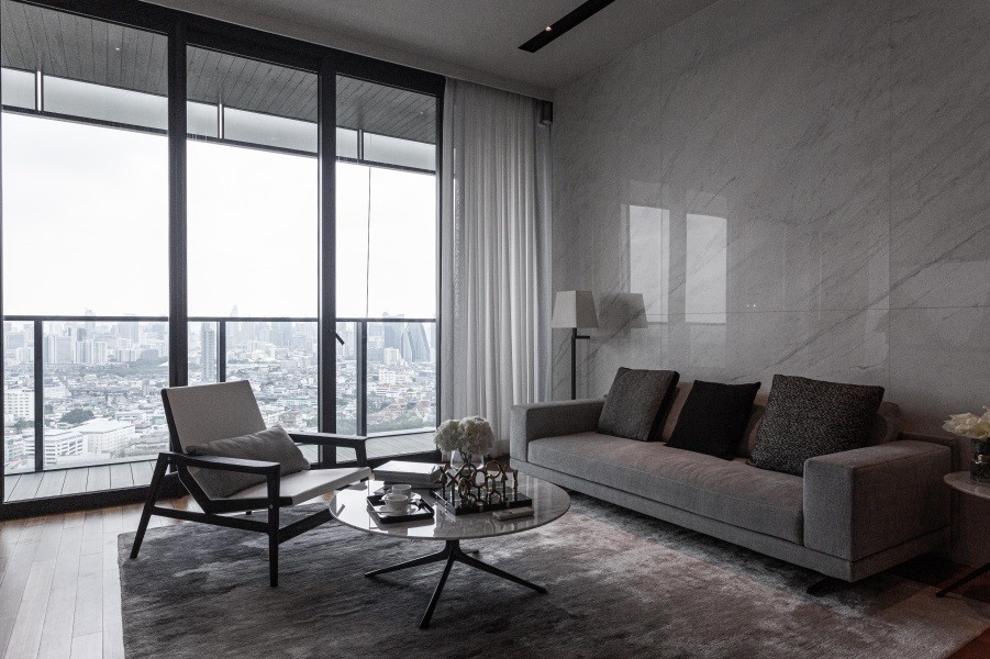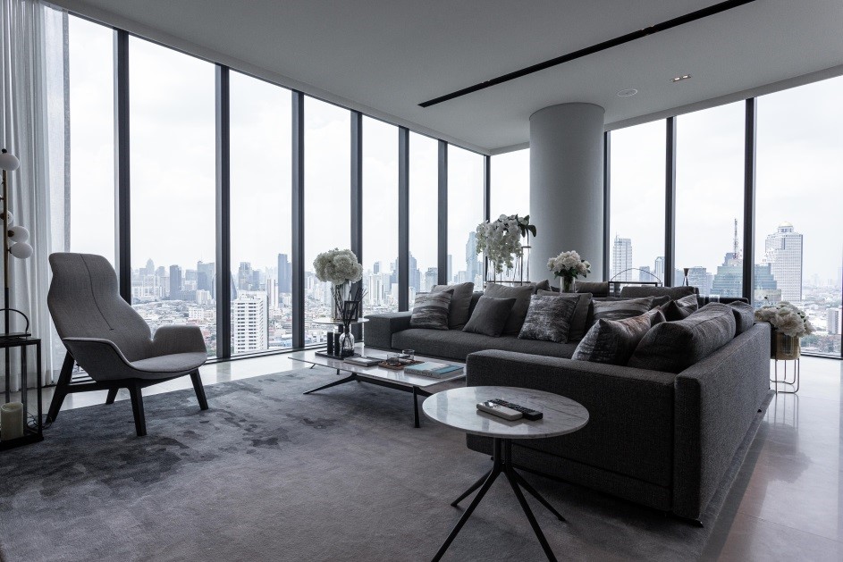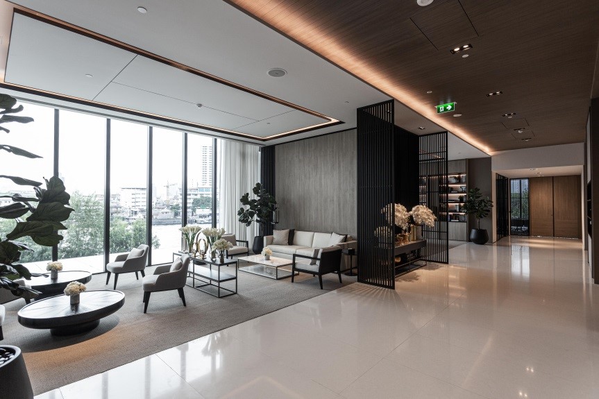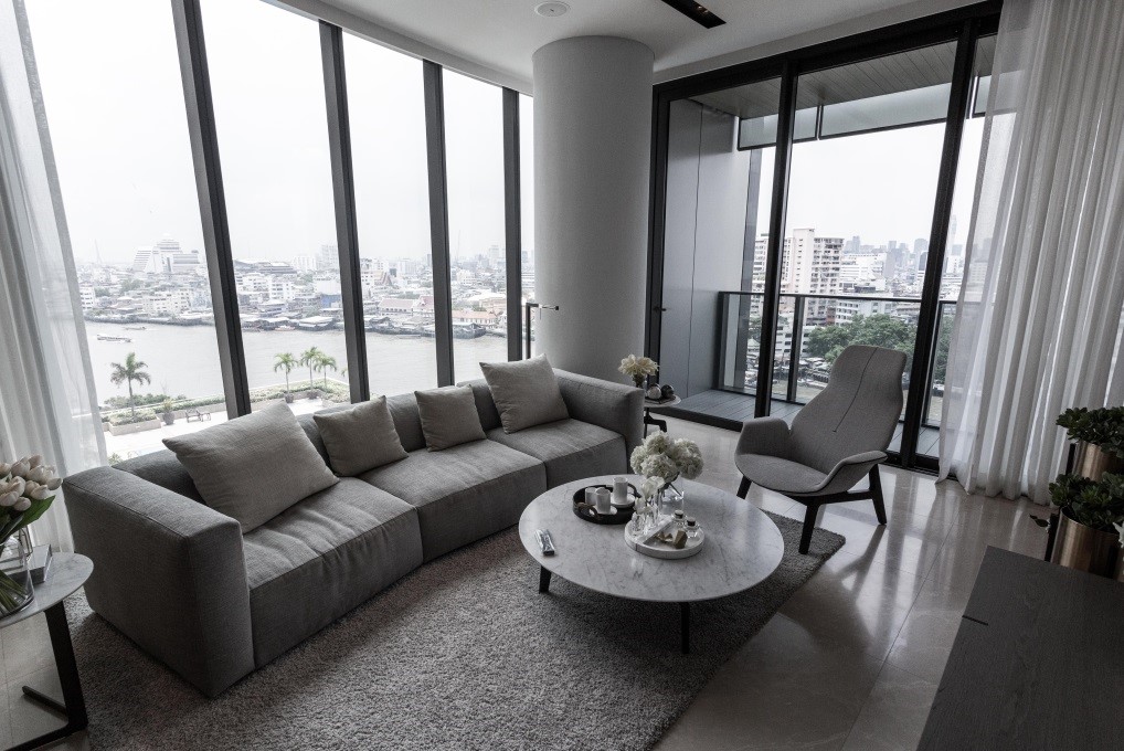 เมื่อเข้าห้องมาทั้งห้องนั่งเล่นสามารถมองเห็นวิวริมน้ำได้ทั้งหมด ด้วยหน้าต่างกระจกสามชั้นทรงสูงบานใหญ่จากพื้นจรดเพดาน 3.20 เมตร กันแสงและเสียงได้เป็นอย่างดี พื้นห้องปูด้วยหินอ่อนคุณภาพดีที่สุดจากประเทศกรีซ ส่วนเฟอร์นิเจอร์นำเข้าทั้งชุดจากประเทศอิตาลีด้วยวัสดุเกรดพรีเมียม แต่ละส่วนของการออกแบบและตกแต่งภายในตัวคอนโดฯ จะได้เห็นถึงความปราณีตและใส่ใจในทุกรายละเอียดของการออกแบบ มองออกไปจากห้องนั่งเล่นจะเห็นวิวของแม่น้ำเจ้าพระยาได้โดยรอบโดยไม่มีสิ่งใดรบกวนสายตา จากราวกั้นตกกระจกบานใหญ่ที่มีความปลอดภัยขั้นสูงสุด โดยกระจกนี้ทำมาจากวัสดุใสที่ได้มาตรฐานความปลอดภัย และเพิ่มความเป็นส่วนตัวด้วยลวดลายพรางตาที่ช่วยลดทอนแสงจากภายนอกได้ด้วย