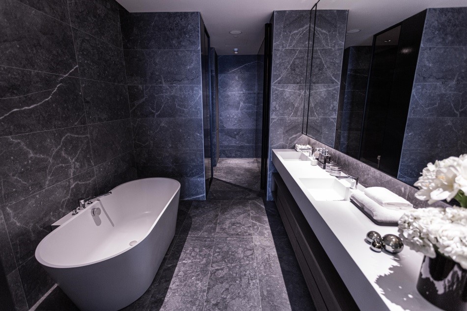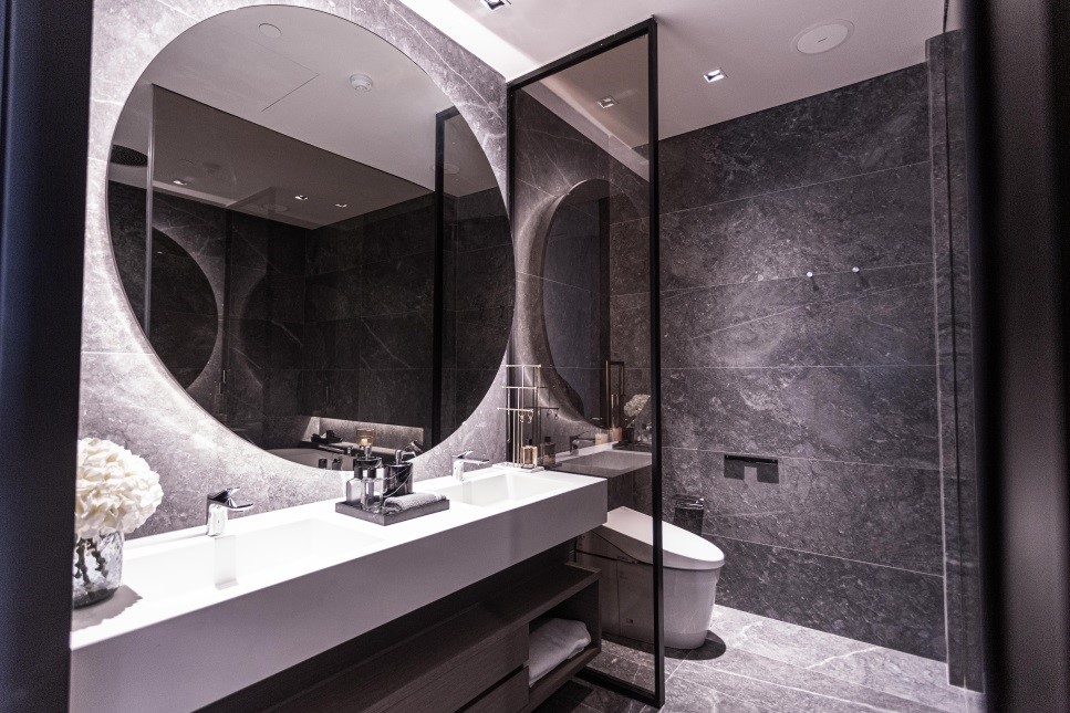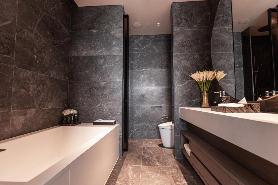 ในส่วนของห้องน้ำที่นี่ออกแบบให้มีห้องน้ำในตัวในทุกห้องนอน โดยภายในห้องน้ำก็เน้นใช้วัสดุและอุปกรณ์อย่างดี มีการแบ่งเป็นพื้นที่ส่วนเปียกและส่วนแห้งออกจากกันชัดเจน การตกแต่งห้องน้ำของที่นี่ทำให้ได้ความรู้สึกประดุจเข้ามาพักในโรงแรมระดับ 5 ดาว โดยมีเค้าท์เตอร์ล้างหน้าขนาดใหญ่แบบ His And Her ที่สามารถวางของใช้ได้ หรือจะเอาของมาวางที่ตู้เก็บของที่อยู่ส่วนล่างก็ได้ ถัดไปอีกด้านจะมีอ่างอาบน้ำไว้นอนแช่ตัวขนาดใหญ่ที่ปรับระบบได้ทั้งน้ำร้อนและน้ำเย็น มีผักบัวและโถสุขภัณฑ์จากแบรนด์ระดับคุณภาพ ทุกอย่างถูกออกแบบและจัดวางไว้เป็นสัดส่วน