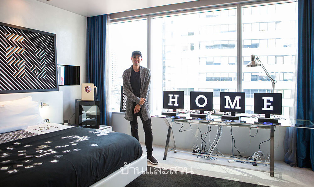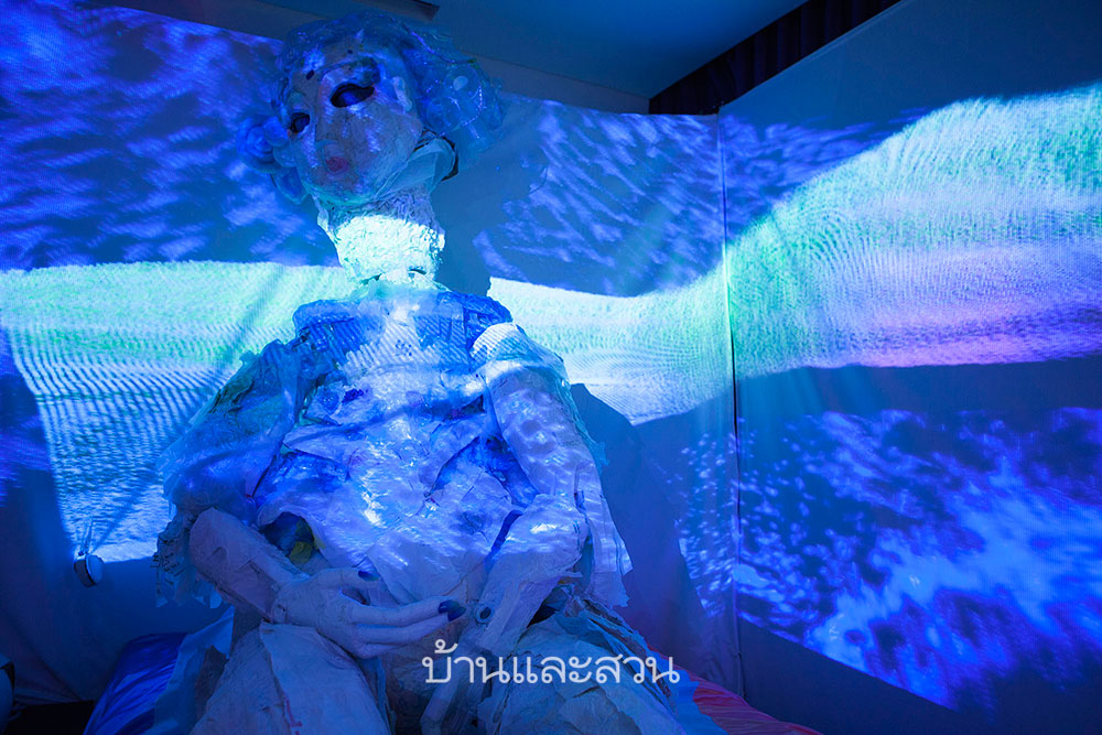 “สำหรับวันนี้ผมมาในนามของ Wonder Fruit ซึ่งยังคง Concept ดนตรี ศิลปะ และ งานออกแบบ เพื่อทำให้คนตระหนักถึงสิ่งแวดล้อม ใน Hotel Art Fair วันนี้ผมได้เปลี่ยนห้องพักให้กลายเป็นพื้นที่แสดงผลงานศิลปะจัดวางประกอบวิดิโออาร์ตและดนตรี ซึ่งเราได้นำผลงาน Puppet ประติมากรรมหุ่นขนาดใหญ่ที่สร้างจากขยะพลาสติก เจ้า 2 ตัวนี้ได้ไปเต้นในเทศกาล Wonder Fruit ปีที่ผ่านมา วันนี้เราลองเอามาจัดแสดงในห้องของโรงแรมดูบ้าง ”