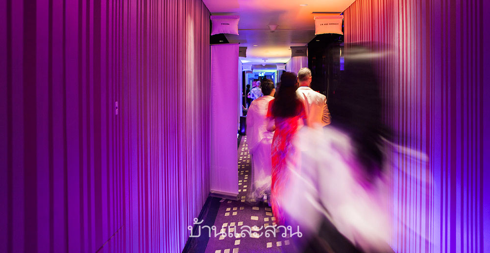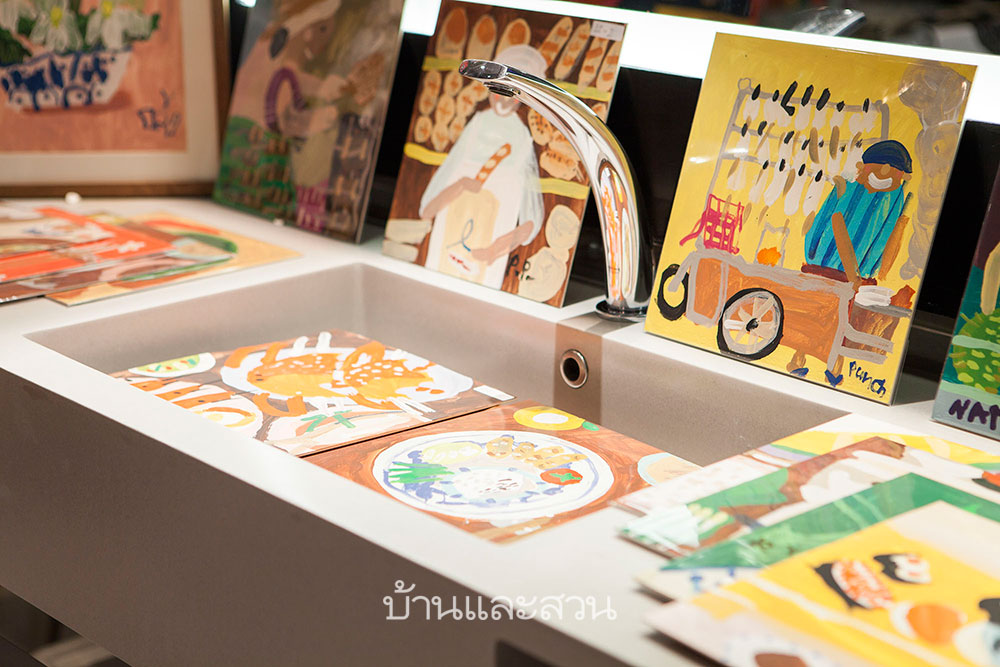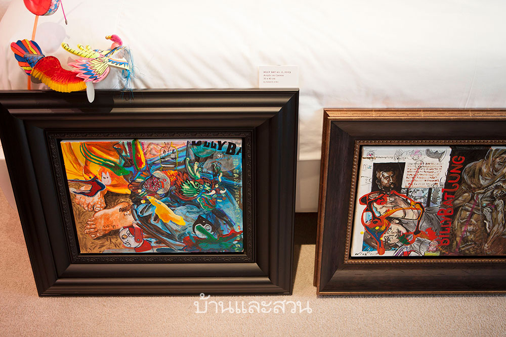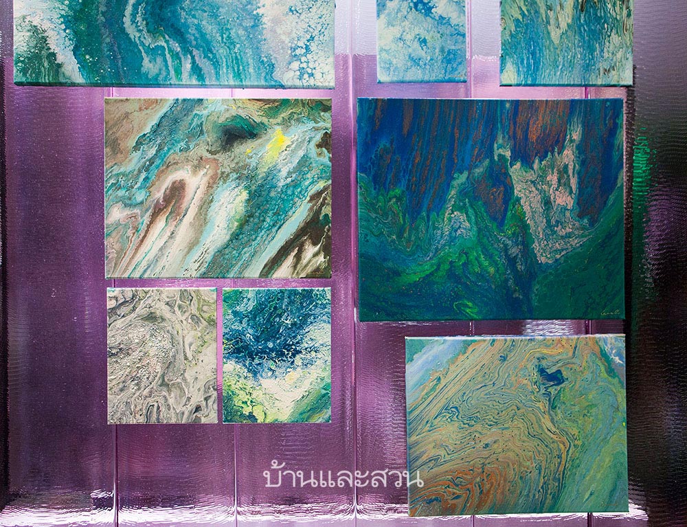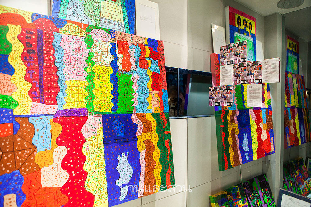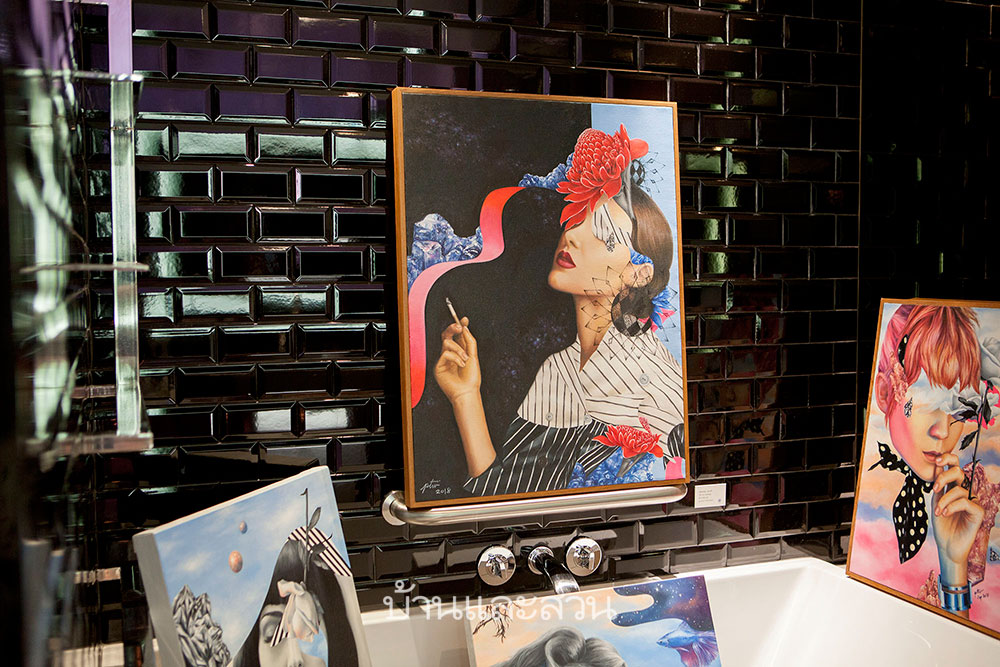 ภายในบริเวณห้องน้ำนั้นเต็มไปด้วยผลงานสีน้ำบนผ้าใบของ ต้องจิตต์ ต่อสุวรรณ