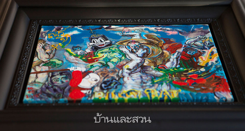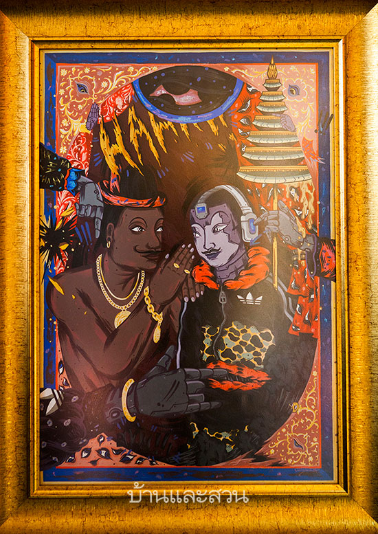 เราถามต่อว่า เมื่อศิลปะไทยแบบประเพณีซึ่งเป็นแนวถนัดของคุณพ่อ มีองค์ประกอบของวัฒนธรรมสมัยใหม่อย่างเพลง Hiphop หรือ Graffiti หรืออะไรพวกนี้เข้าไปด้วย คุณพ่อว่าอย่างไรบ้าง