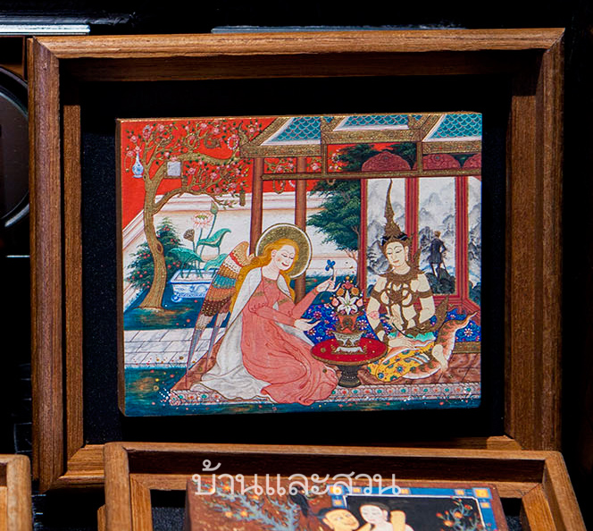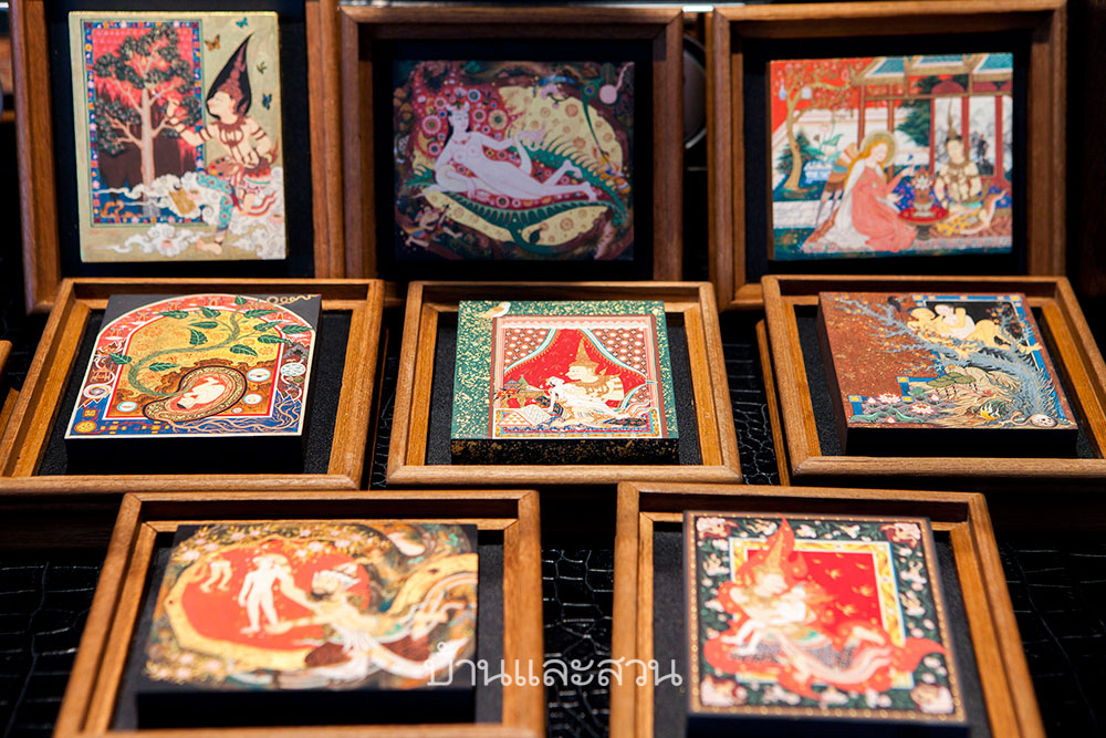 อีก Highlight ของห้องนี้คือ ชุดผลงานจิตรกรรมไทยขนาดเล็ก Philosophy of Tree Miracle “รุกขปรัชญา” ของ สุบรรณกริช ไกรคุ้ม ที่เจ้าตัวเชื่อว่าผลงานขนาดเล็กนี้ จะทำให้ผู้ชมต้องพินิจพิจารณากับรายละเอียดและความสวยงามต่างๆ ซึ่งทั้งหมดที่เห็นนี้เป็นผลงานสีฝุ่นบนแผ่นไม้ ที่หลายชิ้นเสริมกลิ่นอายสุนทรีย์แบบไทยด้วยการลงรักปิดทอง ในบางผลงานดูเผินๆลายเส้นนั้นจะมีลักษณะคล้ายกับจิตรกรรมไทยประเพณีแต่ท่วาเรื่องราวหรือองค์ประกอบของภาพนั้นได้ใจแรงบันดาลใจจากผลงานศิลปะต่างประเทศ อย่างชิ้นที่ สุบรรณกริช กำลังถืออยู่นั้น วาดโดยใช้องค์ประกอบภาพจากเหตุการณ์สำคัญ ในศาสนาคริสต์ “แม่พระรับสาร” (Annunciation) ซึ่งเป็นเรื่องราวในพระวรสารนักบุญลูกา อธิบายถีงเหตุการณ์ที่ ทูตสวรรค์กาเบรียล ได้ส่งมาส่งสารให้พระแม่มารีย์ทราบว่าจะตั้งครรภ์พระบุตรพระเป็นเจ้า ซึ่งเหตุการณ์ Annunciation นี้ได้ถูกหยิบยกนำไปสร้างเป็นผลงานจิตรกรรมมากมายในช่วงศตววรษที่ 14-15 ในแวดวงการศิลปะตะวันตก ใน Version ของ สุบรรณกริช นั้นเขาต้องการสื่อถึงความสงบ ที่ให้เทพยดานางฟ้าต่างๆ(ไม่ว่าจะเทพไทย หรือ ฝรั่ง) สามารถอยู่ร่วมกันได้อย่างสงบสุข ซึ่งจะเห็นว่าเมื่อสงบสุข ต้นไม้วิเศษที่เติมไปด้วยแก้วแหวนเงินทอง ไม่จำเป็นอีกต่อไป และ ด้านขวา(หลังนางฟ้าแบบไทย) ยังเผยฉากที่ซ่อนไว้เป็นภาพวาดจากภาพ Wanderer above the Sea of Fog ของ Caspar David Friedrich เพื่อทำให้เห็นว่ามนุษย์ที่สุดแล้วของทุกศาสนานั้นก็ต้องการเพียงแค่ความสุข ประหนึ่งชายในภาพ ที่แค่มายืนดูหมู่มวลหมอกก็มีความสุขแล้ว