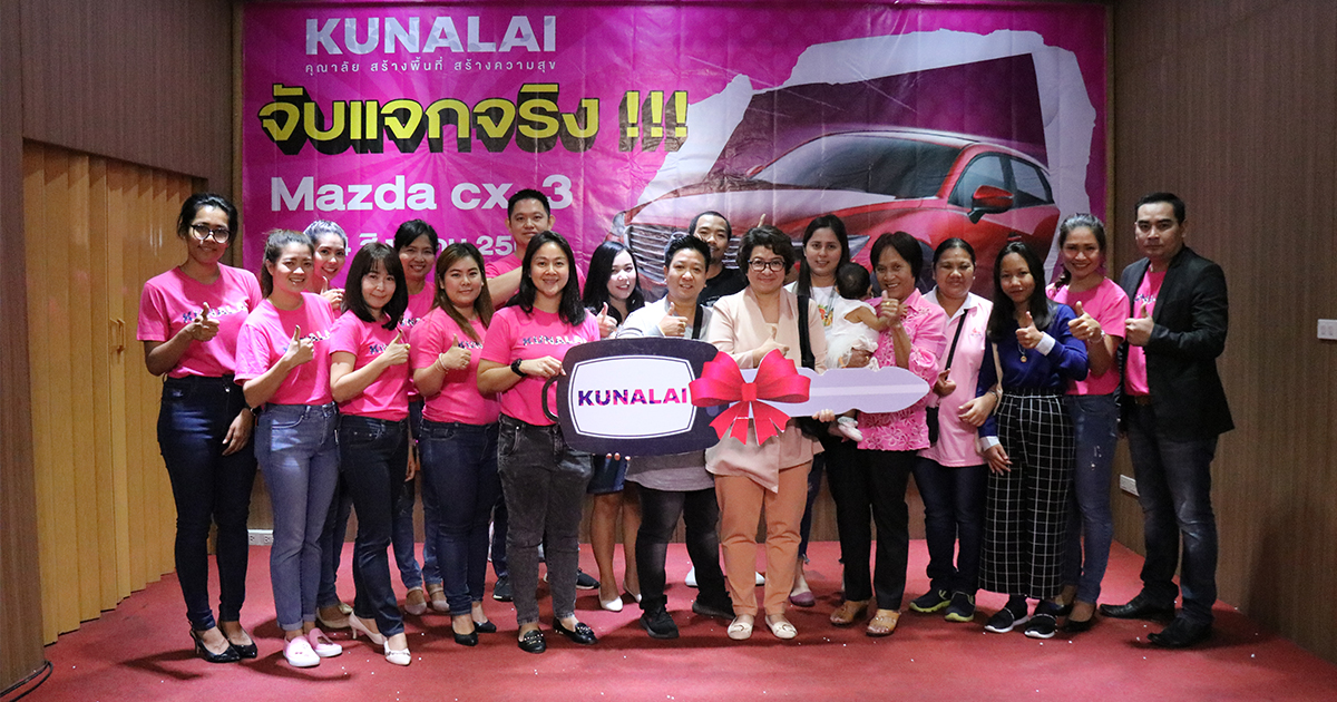 วันอาทิตย์ ที่ 4 สิงหาคม 2562 ที่ผ่านมา บริษัท วิลล่าคุณาลัย จำกัด (มหาชน) นำทีมโดย คุณประวีรัตน์ เทวอักษร ประธานเจ้าหน้าที่บริหาร และ คุณสุรเดช ประจวบศรีรัตน์ ผู้อำนวยการฝ่ายบัญชีการเงินและงบประมาณ จับแจกจริง !!! มอบรถยนต์ MAZDA CX3 รุ่น 2.0e ราคา 879,000 บาท (จำนวน 1 คัน) ให้กับลูกค้าที่ได้รับโปรโมชั่นร่วมจับรถ ภายในปี 2561 ณ โรงแรม แกรนด์ ราชพฤกษ์ จ.นนทบุรี