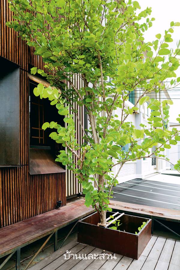 “สิ่งที่รับรู้ตรงหน้าอาจเป็นมากกว่าที่เห็น โดยซ่อนฟังก์ชันแท้จริงไว้ให้ขบคิด” คุณแมวอธิบายวิธีคิดเมื่อเข้ามายังบริเวณหน้าบ้านที่ปกติแทบทุกบ้านจะต่อเติมหลังคาเป็นที่จอดรถ “ให้ความสำคัญกับวิธีคิดและการใช้ชีวิต เป็นการมองย้อนกลับไปยังพื้นฐานเพื่อค้นหาตัวตนของเรา แล้วสะท้อนออกมาเป็นอย่างนั้น ผลลัพธ์ที่แตกต่างจึงเริ่มจากความคิดที่ไม่ตายตัว เมื่อหน้าบ้านมีพื้นที่จำกัดเช่นนี้ จึงต้องคุยกับตัวเองว่าอยากได้สวนหน้าบ้านหรือที่จอดรถมากกว่ากัน เมื่อคำตอบคือสวน จึงออกแบบให้เป็นสวนที่จอดรถได้ ผลลัพธ์จึงต่างจากการทำที่จอดรถแล้วตกแต่งด้วยต้นไม้”